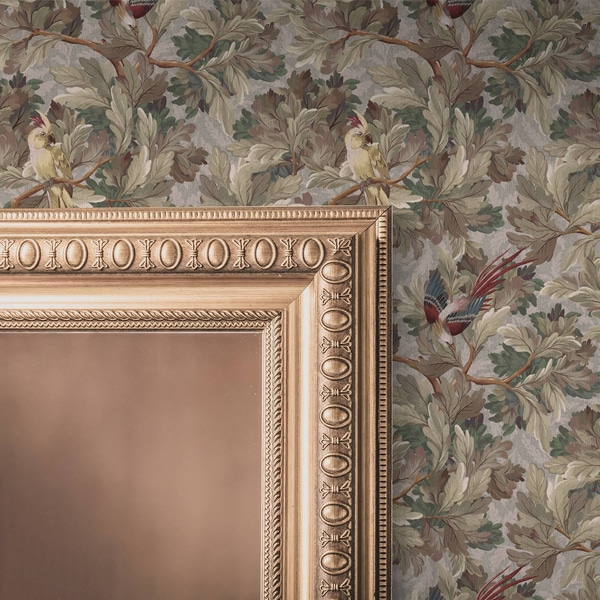 Damaskikangas, jossa kasvi-aiheisia koristekuvioita, oliivi-okranvärinen paletti