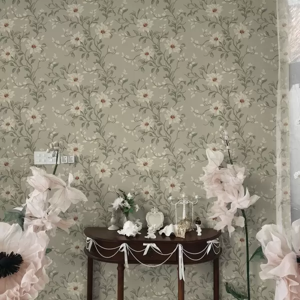 Tapetti Valkoisia kukkia ja kiemurtelevia lehtiä vaalealla pohjalla Nr. a00001v1