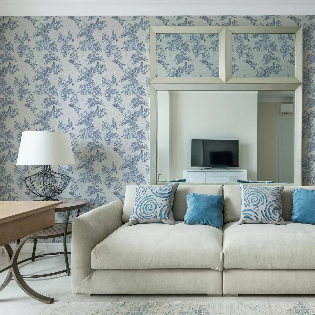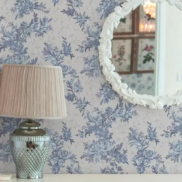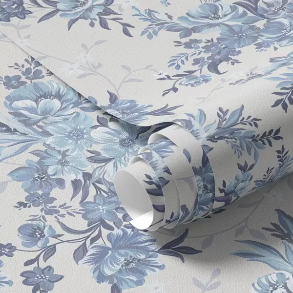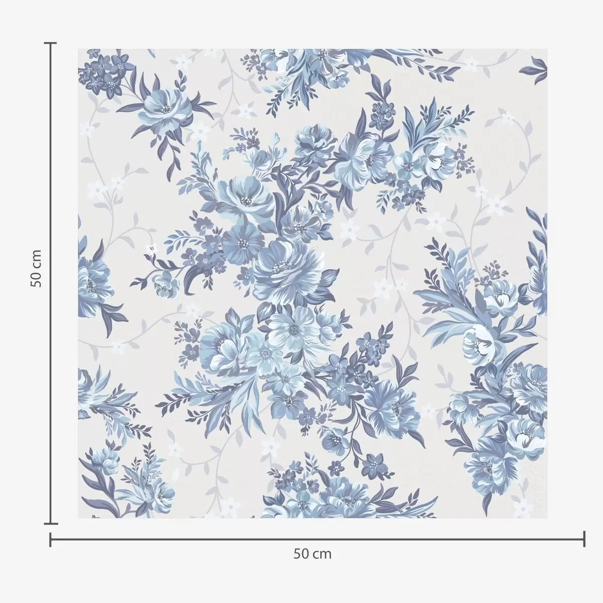Tapetti Herkät kukat ja lehdet sinisellä ja sinisellä värillä vaalealla pohjalla Nr. a00027