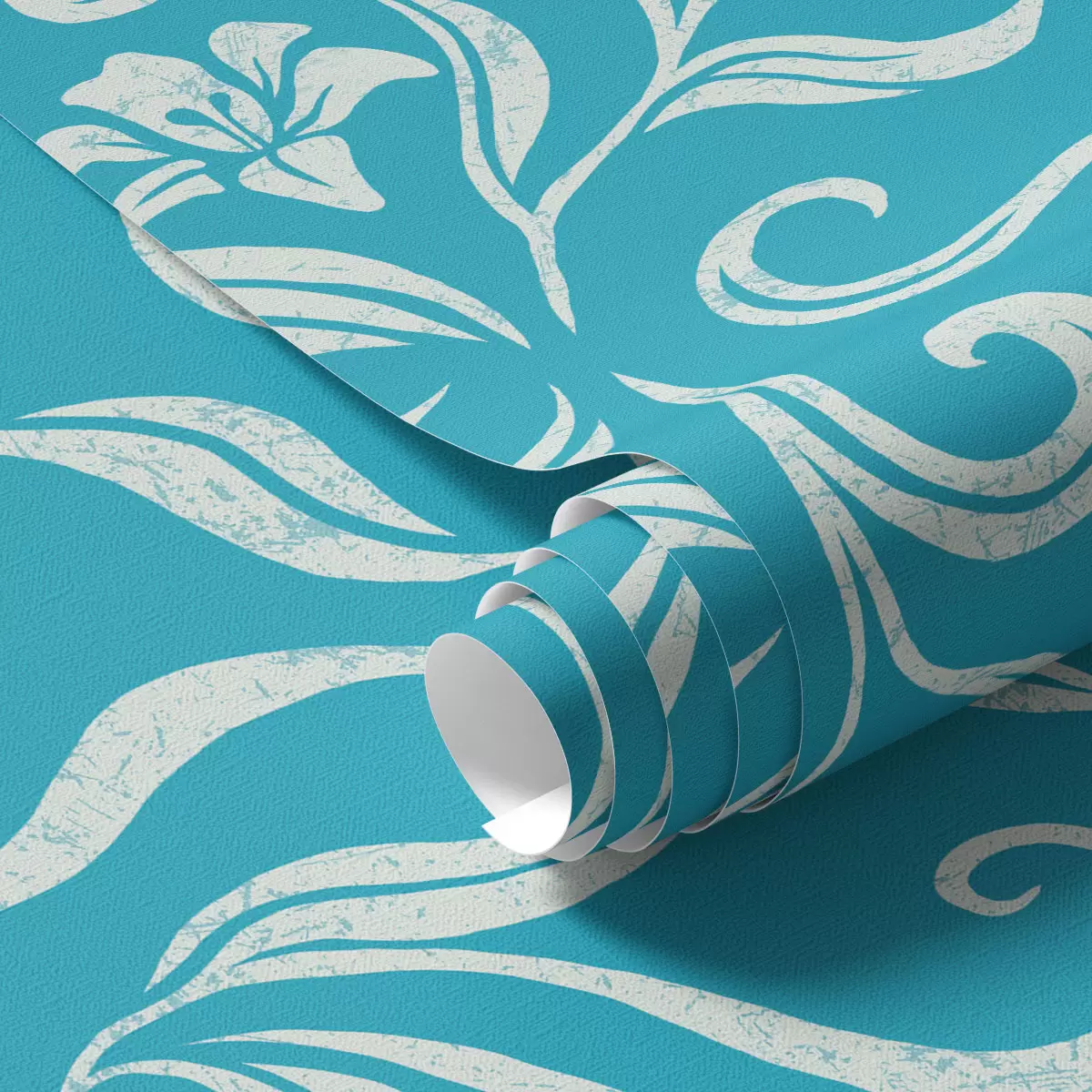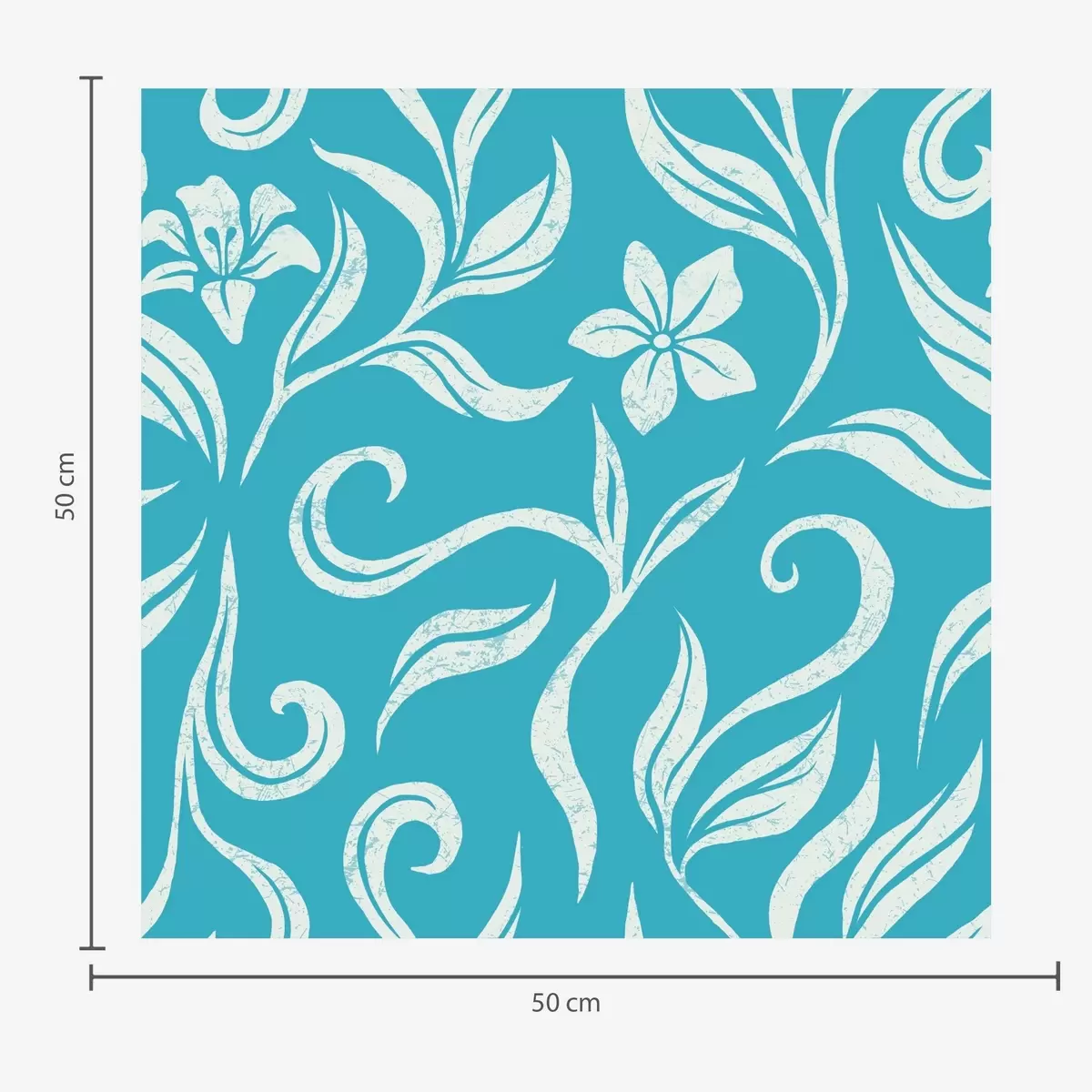 Tapetti Valkoisia kukkia ja lehtiä, joissa on naarmuja sinisellä pohjalla Nr. a00038
