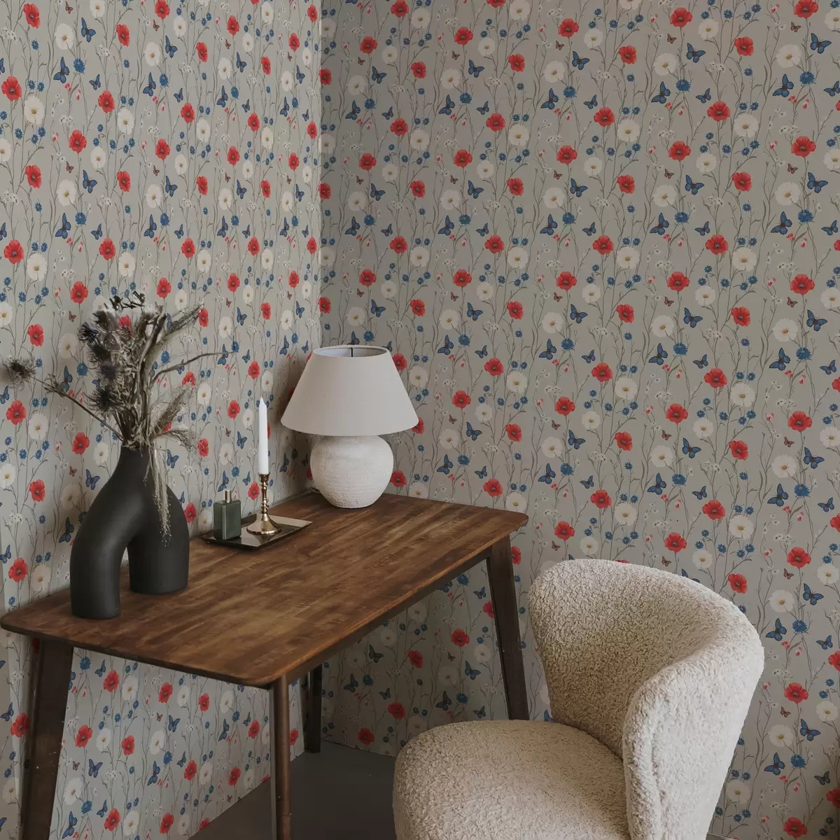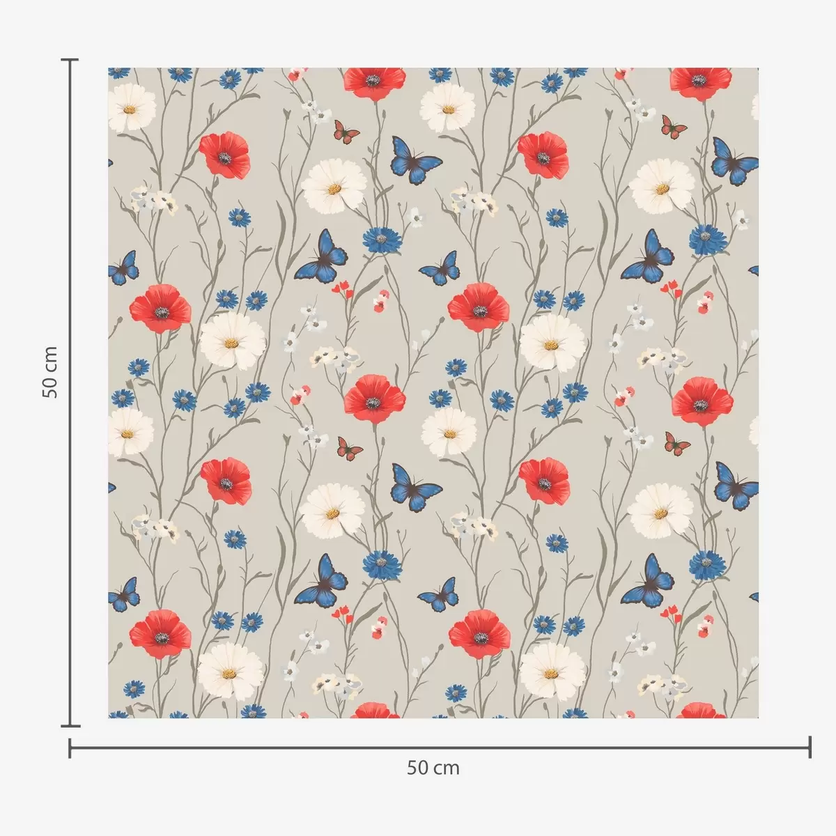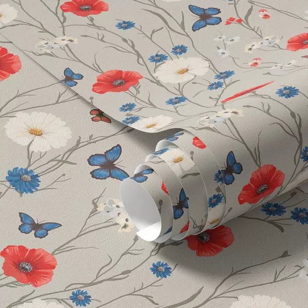 Tapetti Unikot, päivänkakkarat ja perhoset vaaleanharmaalla taustalla Nr. a00072v1