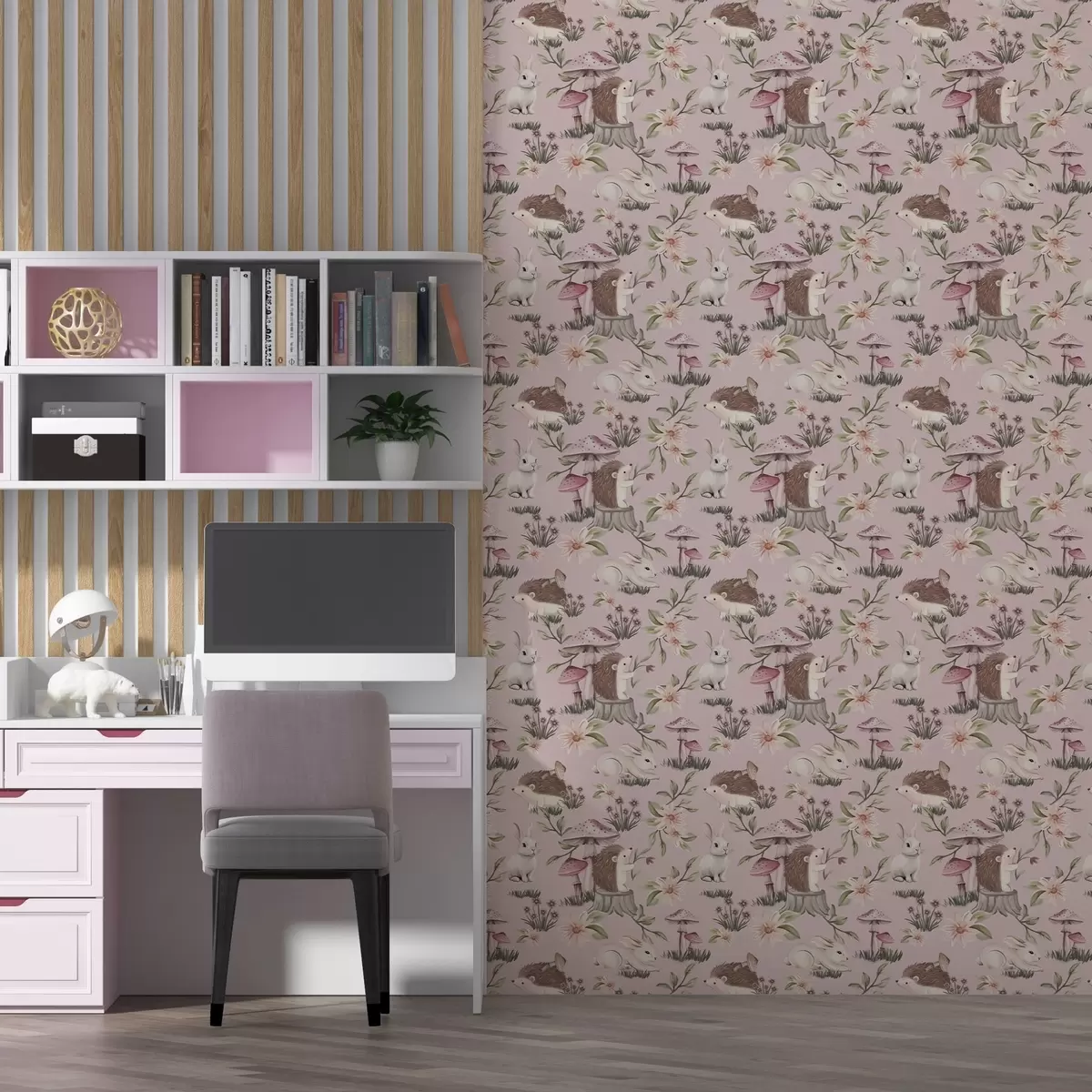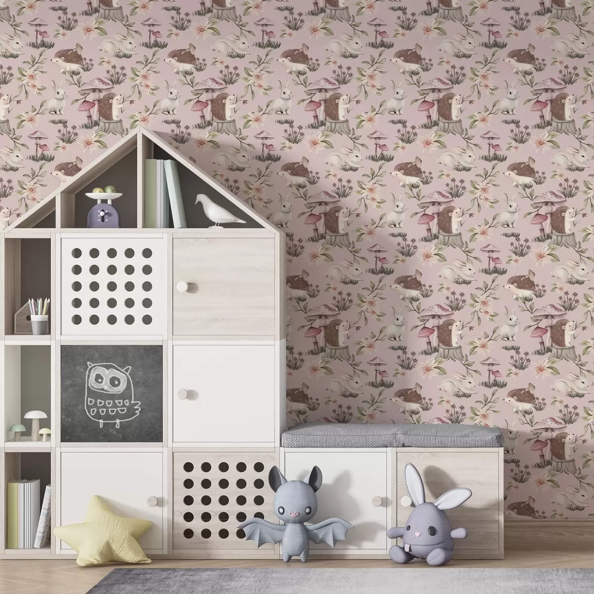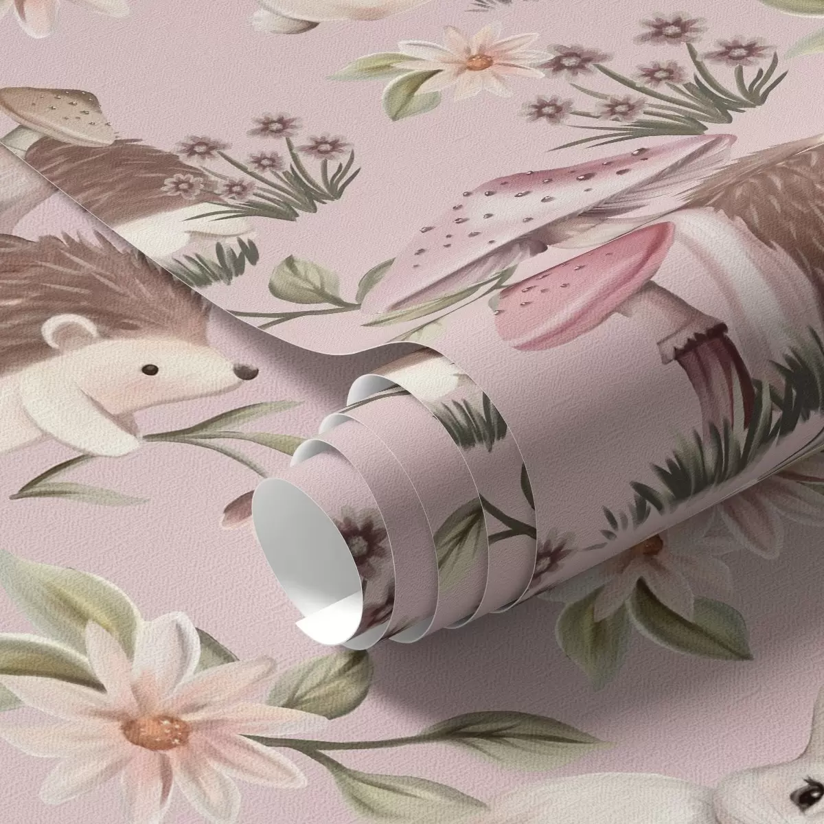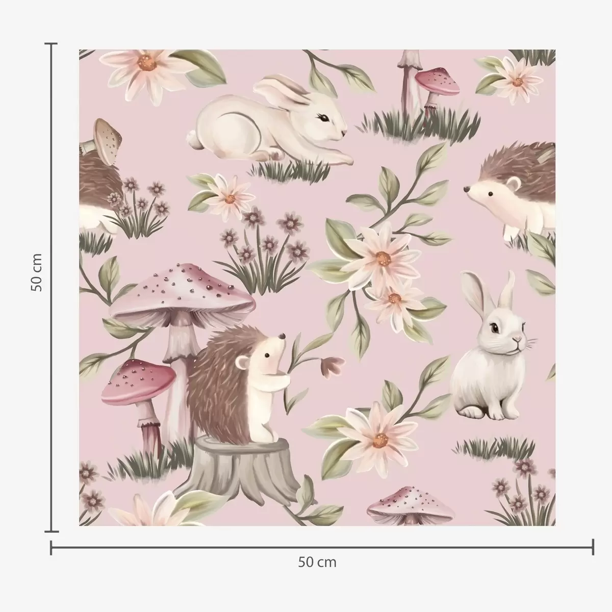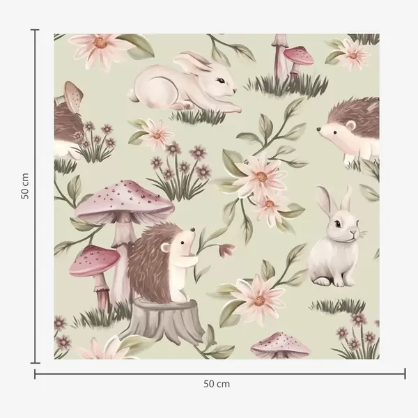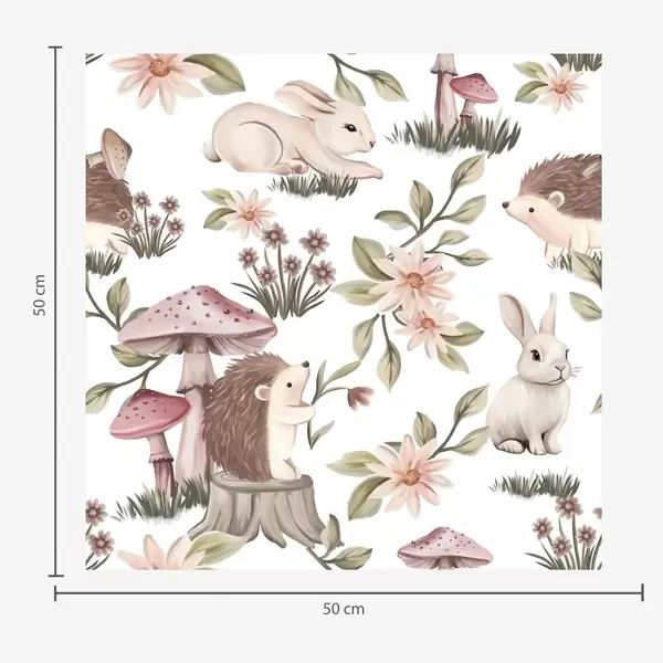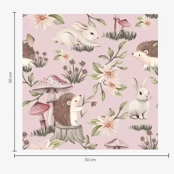 Tapetti Satumaista tyyliä siilejä, kaneja ja kukkia sienien keskellä vaaleanpunaisella taustalla Nr. a00111