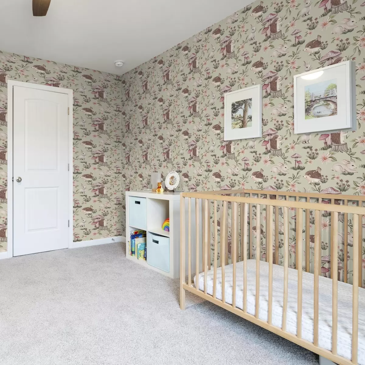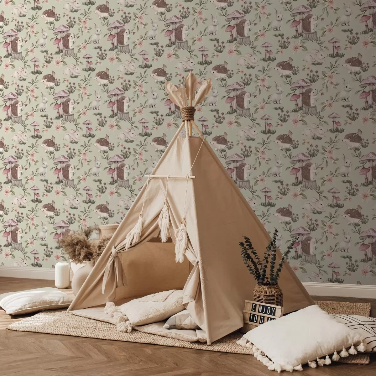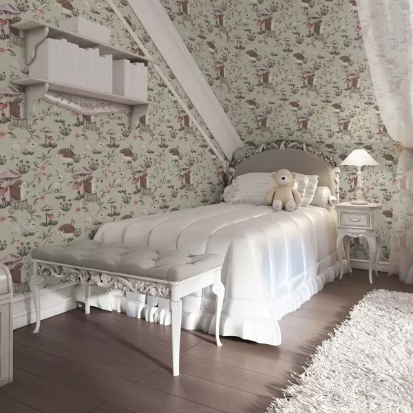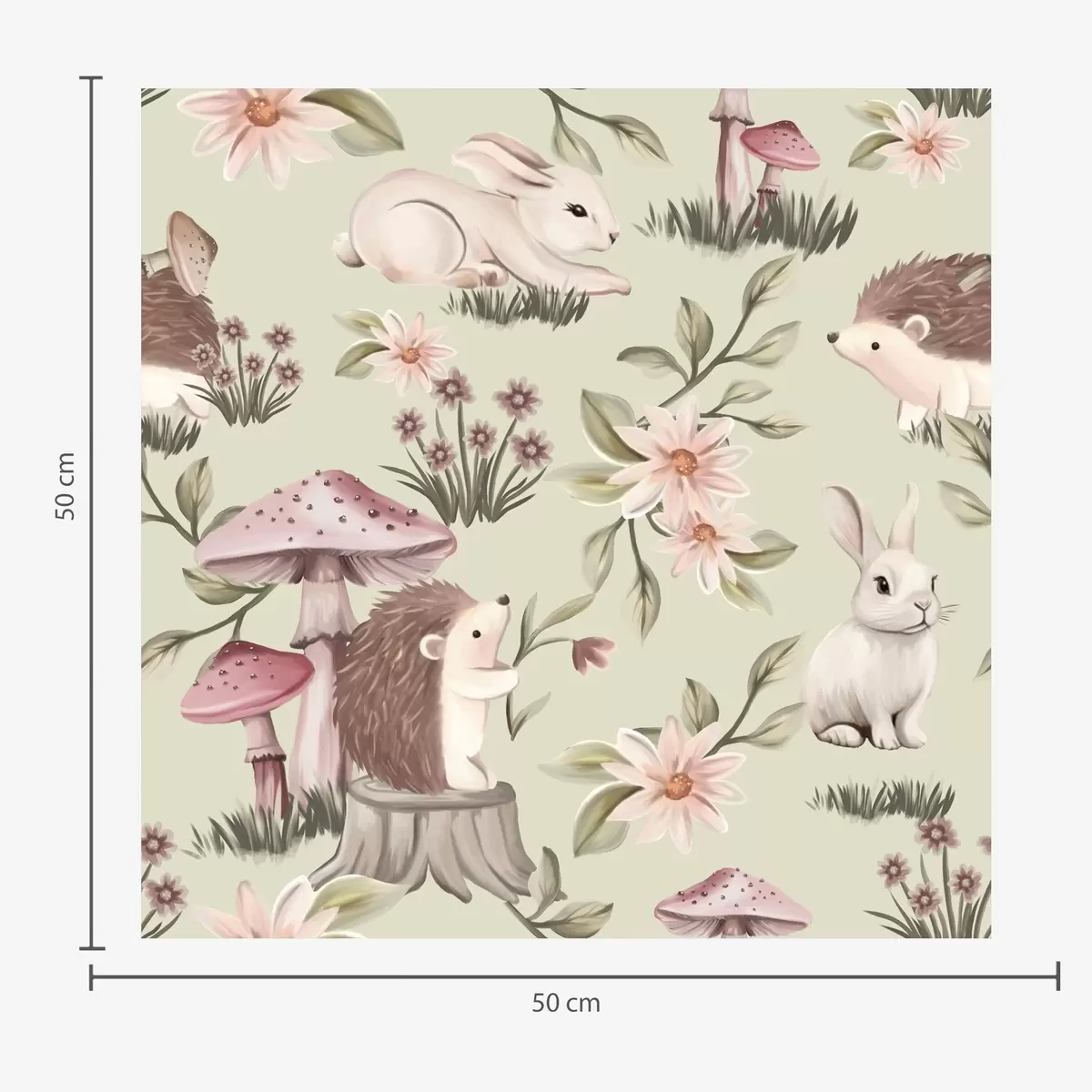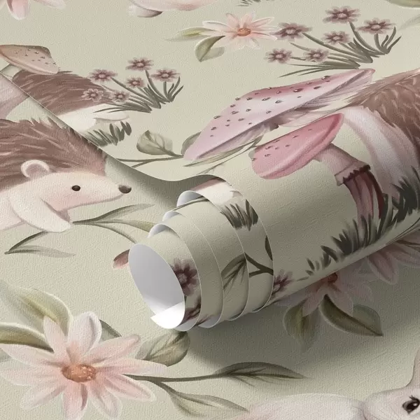 Tapetti Satumaista eläimiä ja kukkia vihreällä pohjalla herkillä pastelliväreillä Nr. a00111v1