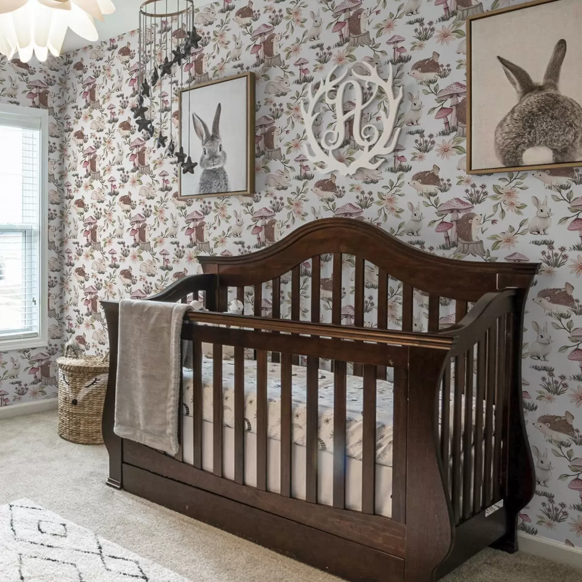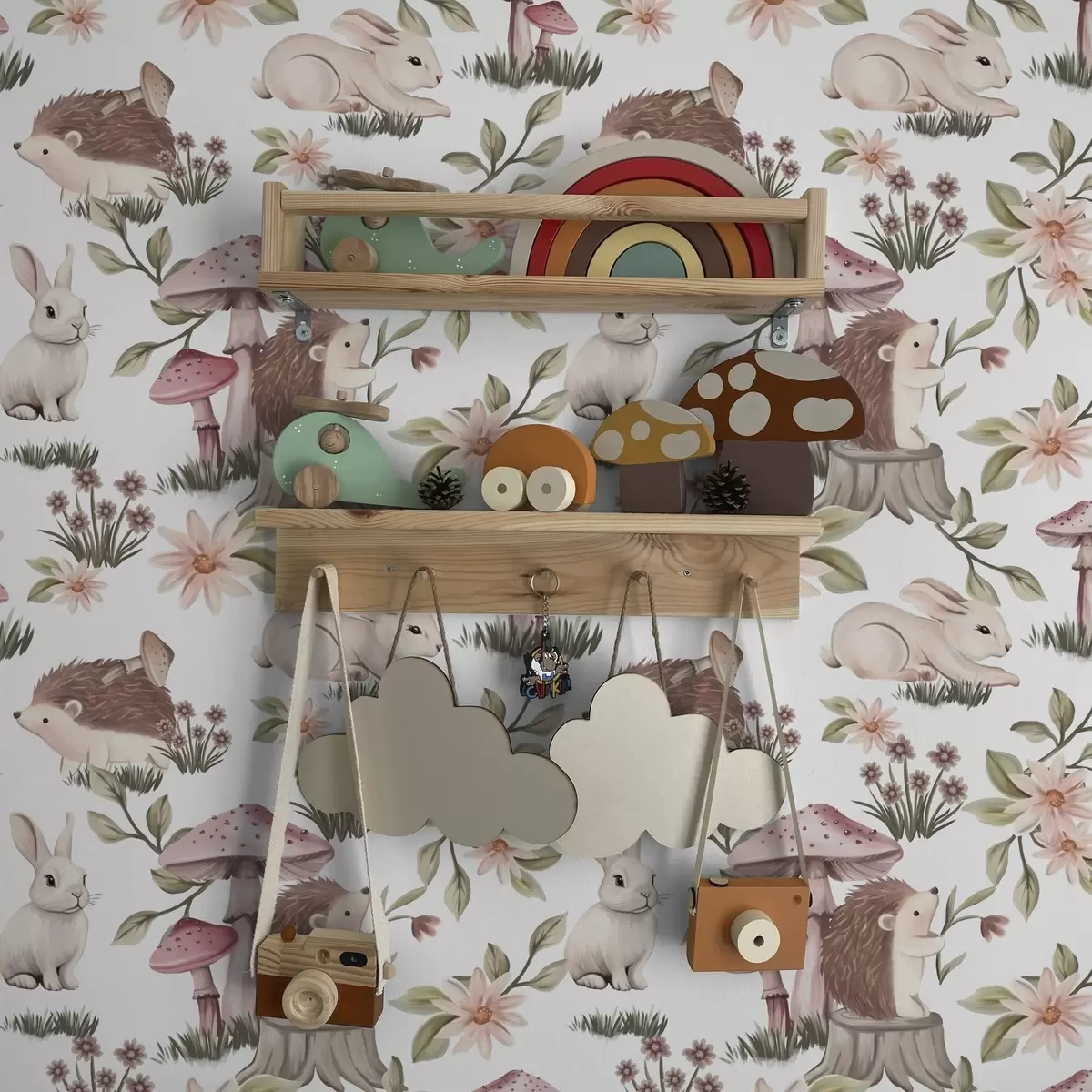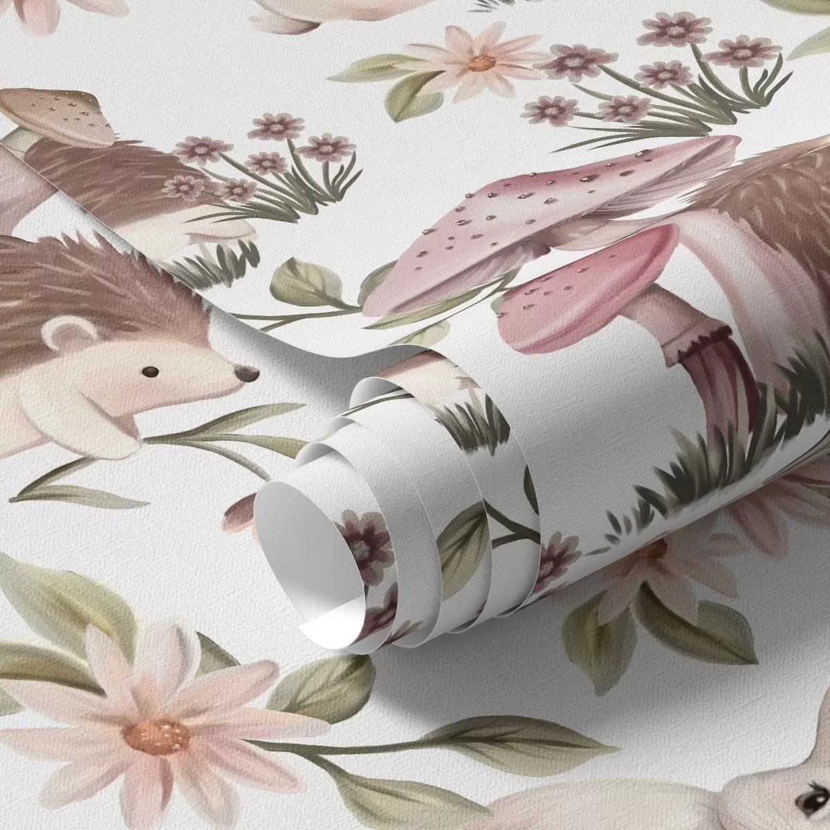 Tapetti Siilejä ja kaneja valkoisella pohjalla, jossa on herkkiä kukkia ja sieniä Nr. a00111v2