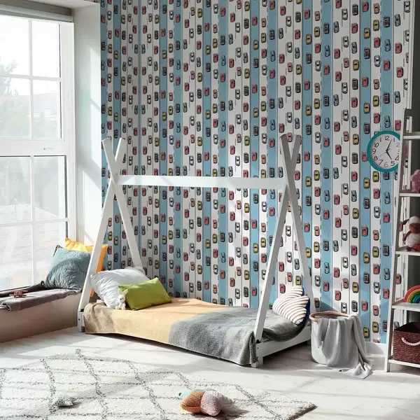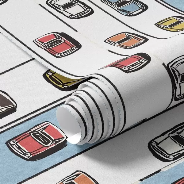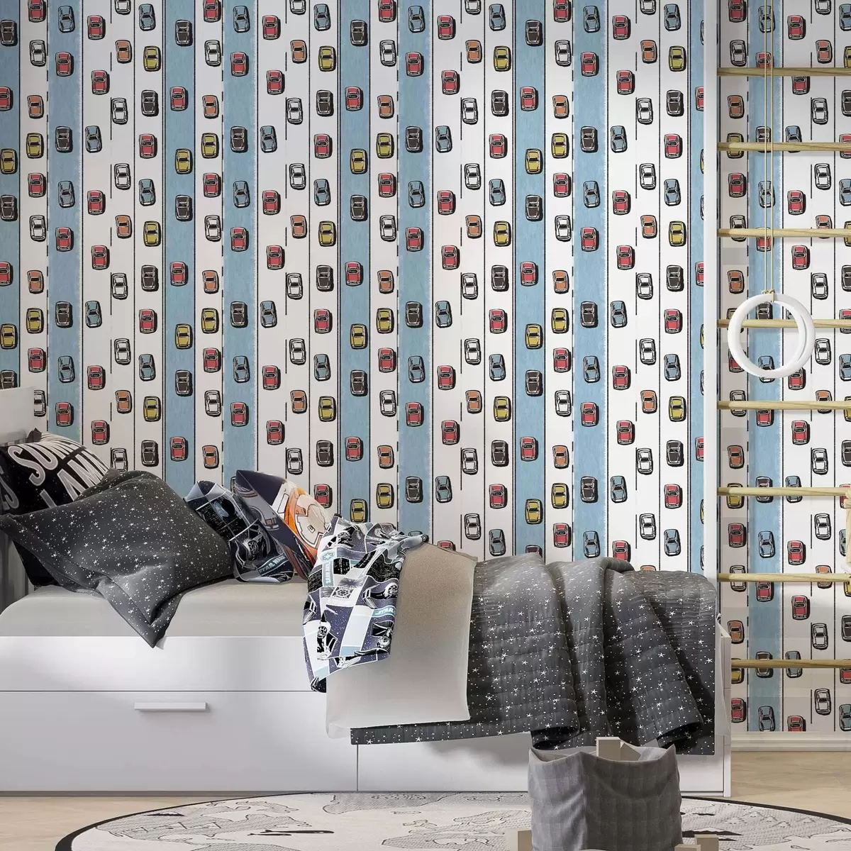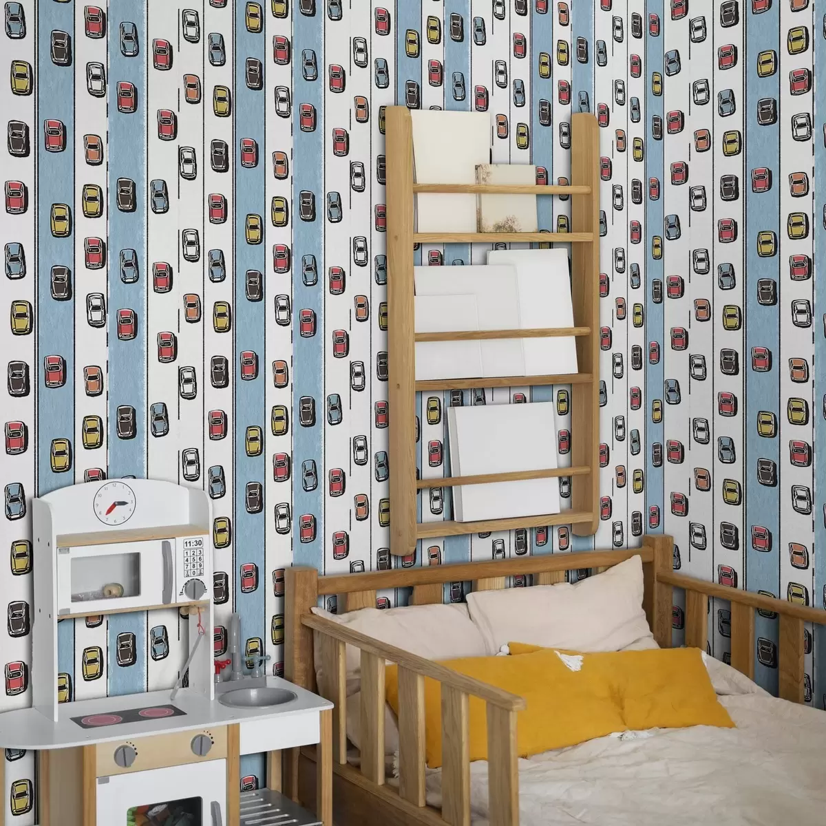 Tapetti Retroauto valkoisella ja sinisellä tiellä 60-luvun tyyliin Nr. a00118v2