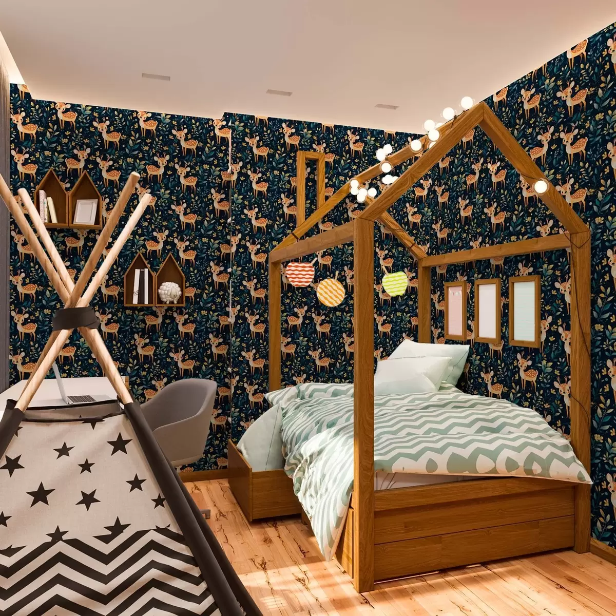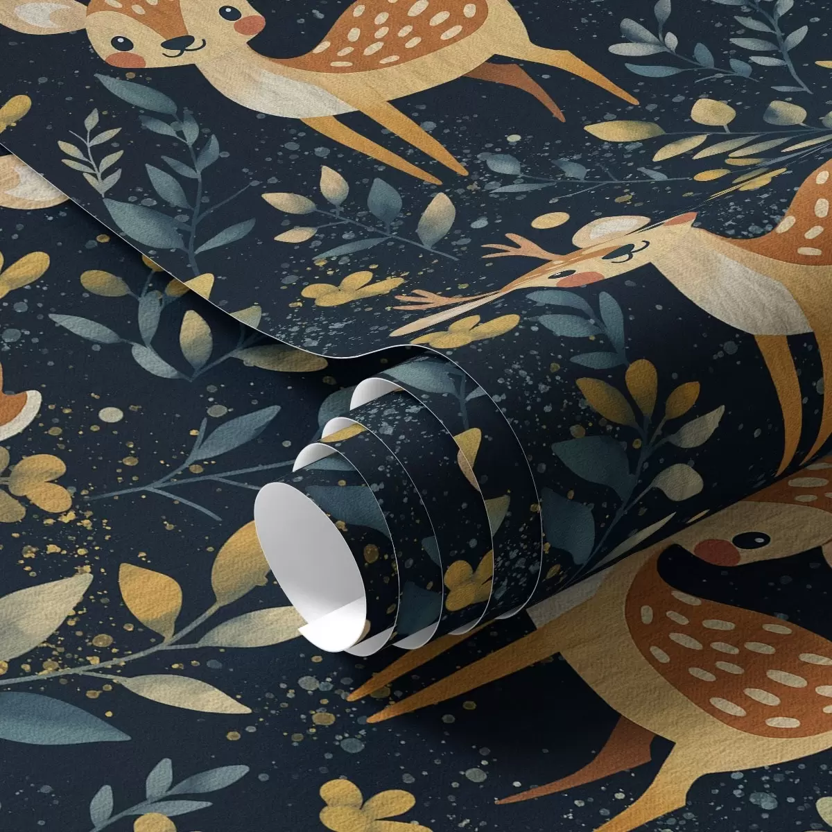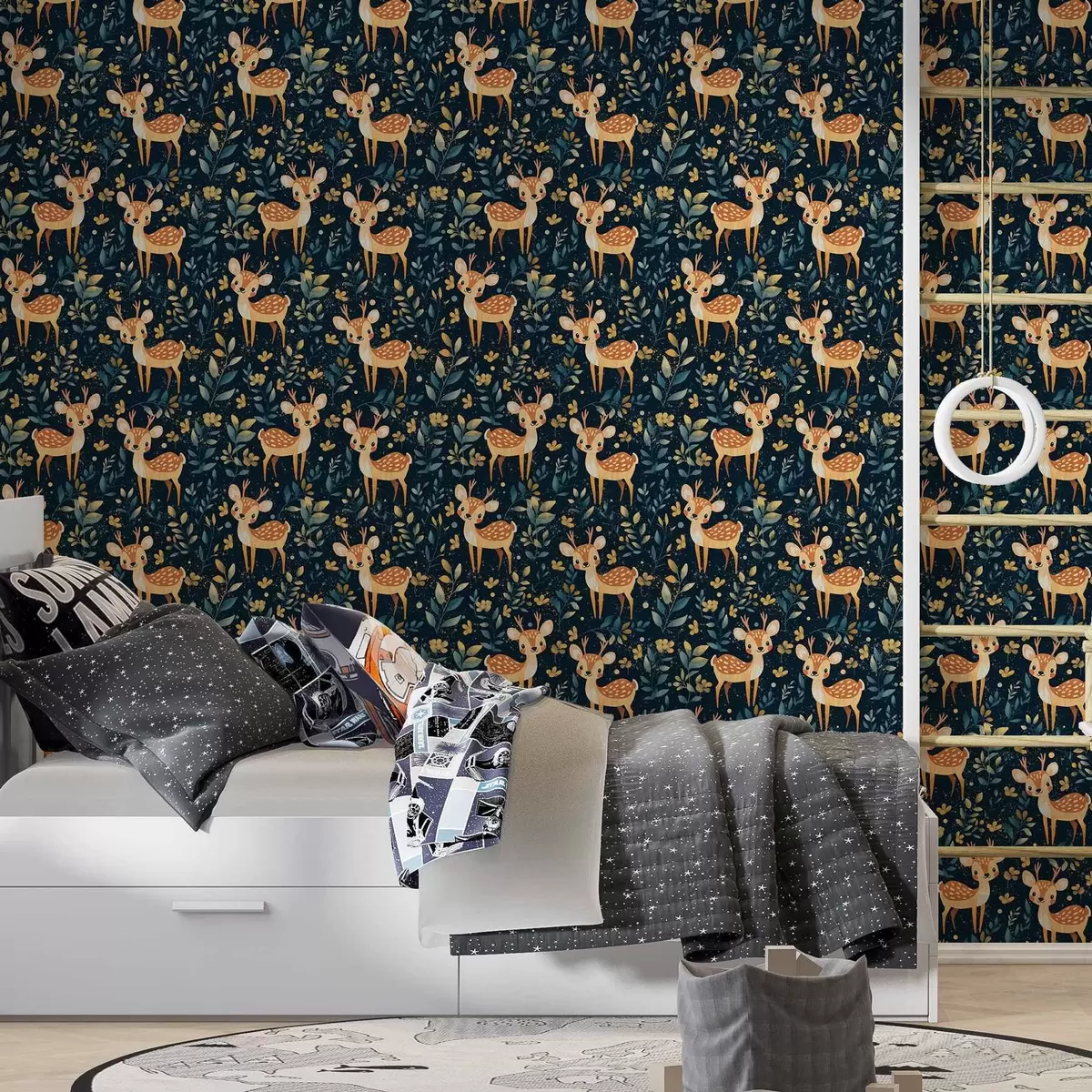 Tapetti Fawn pimeässä metsässä, jossa on keltaiset lehdet Nr. a00124