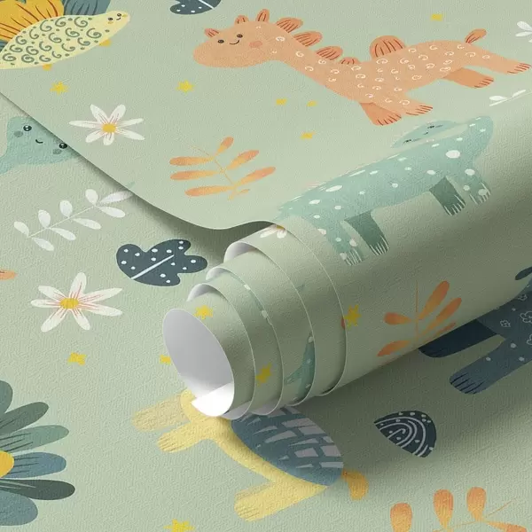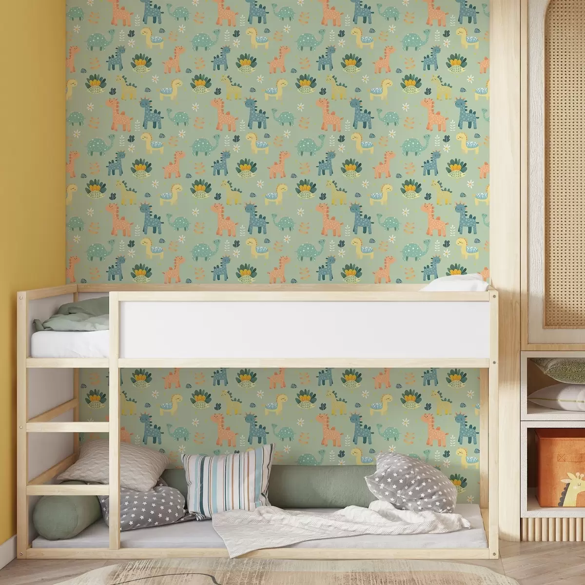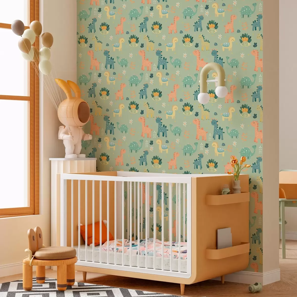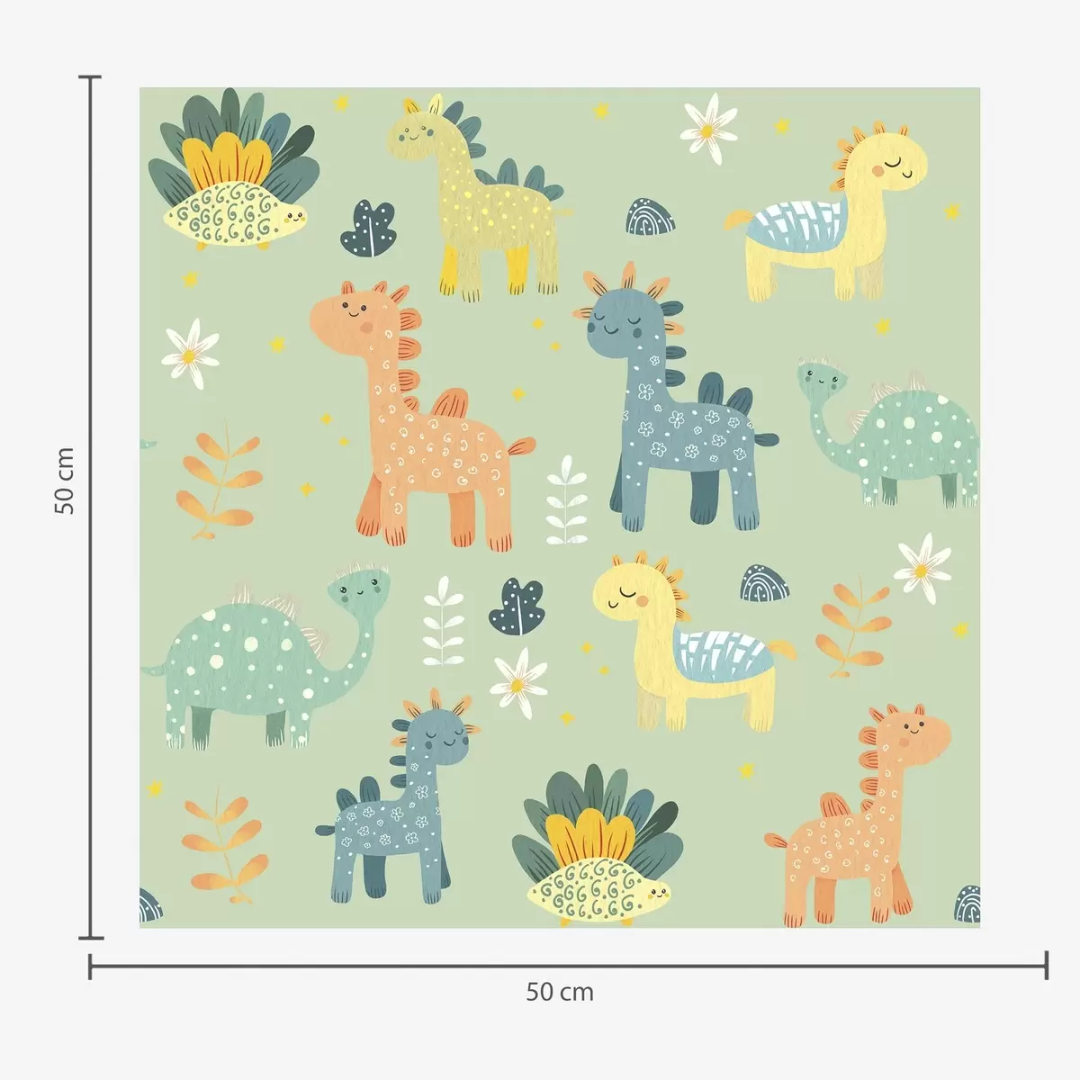 Tapetti Hauskat dinosaurukset pehmeällä vihreällä paletilla vaalealla taustalla Nr. a00125v1