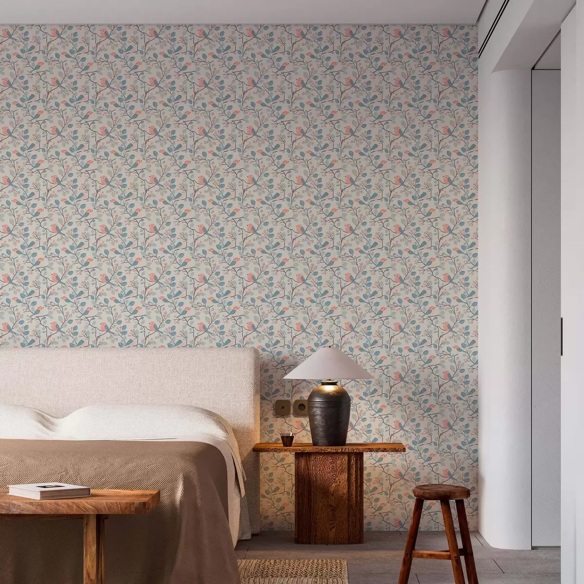 Tapetti Pastellilintuja ja oksia vaalealla taustalla Nr. a00128