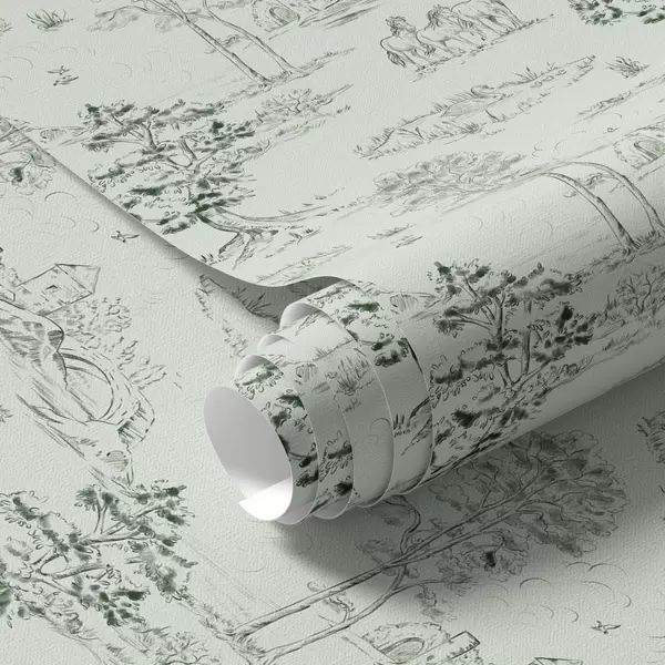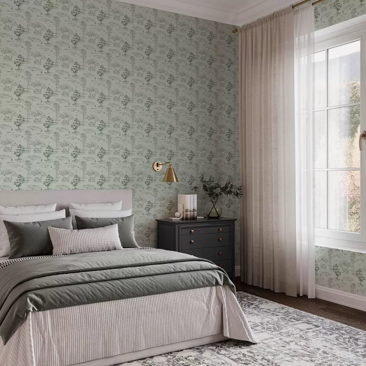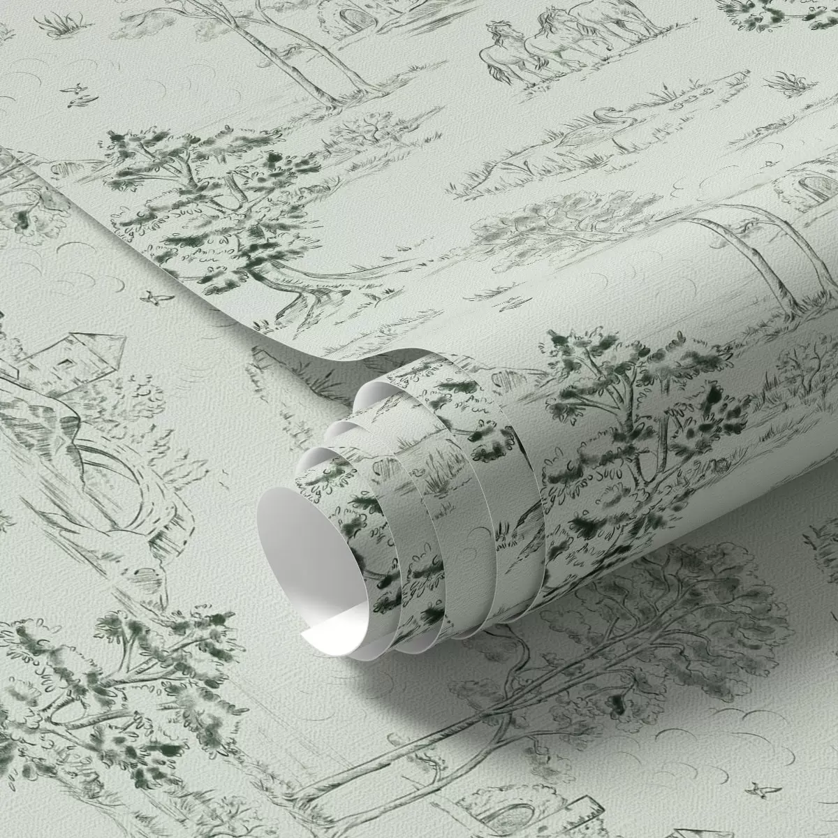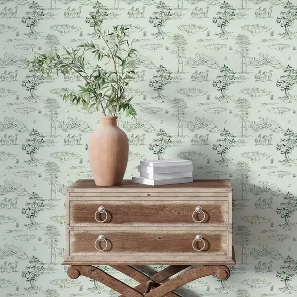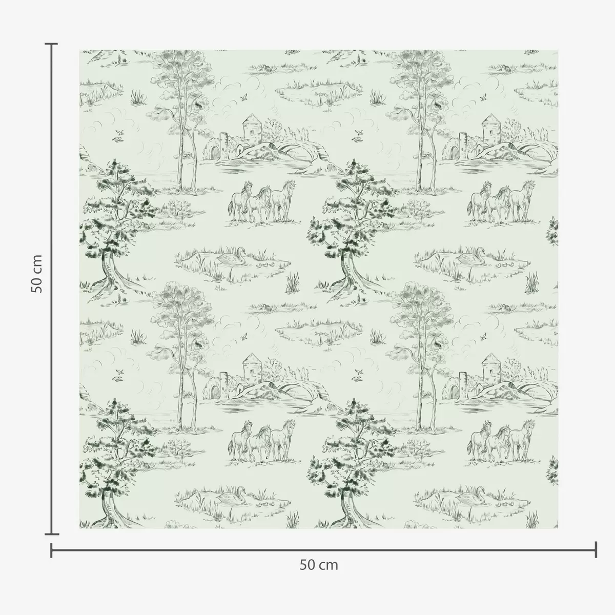 Tapetti Kohtaus, jossa hevosia, puita ja linna vihreällä taustalla Nr. a00133v1
