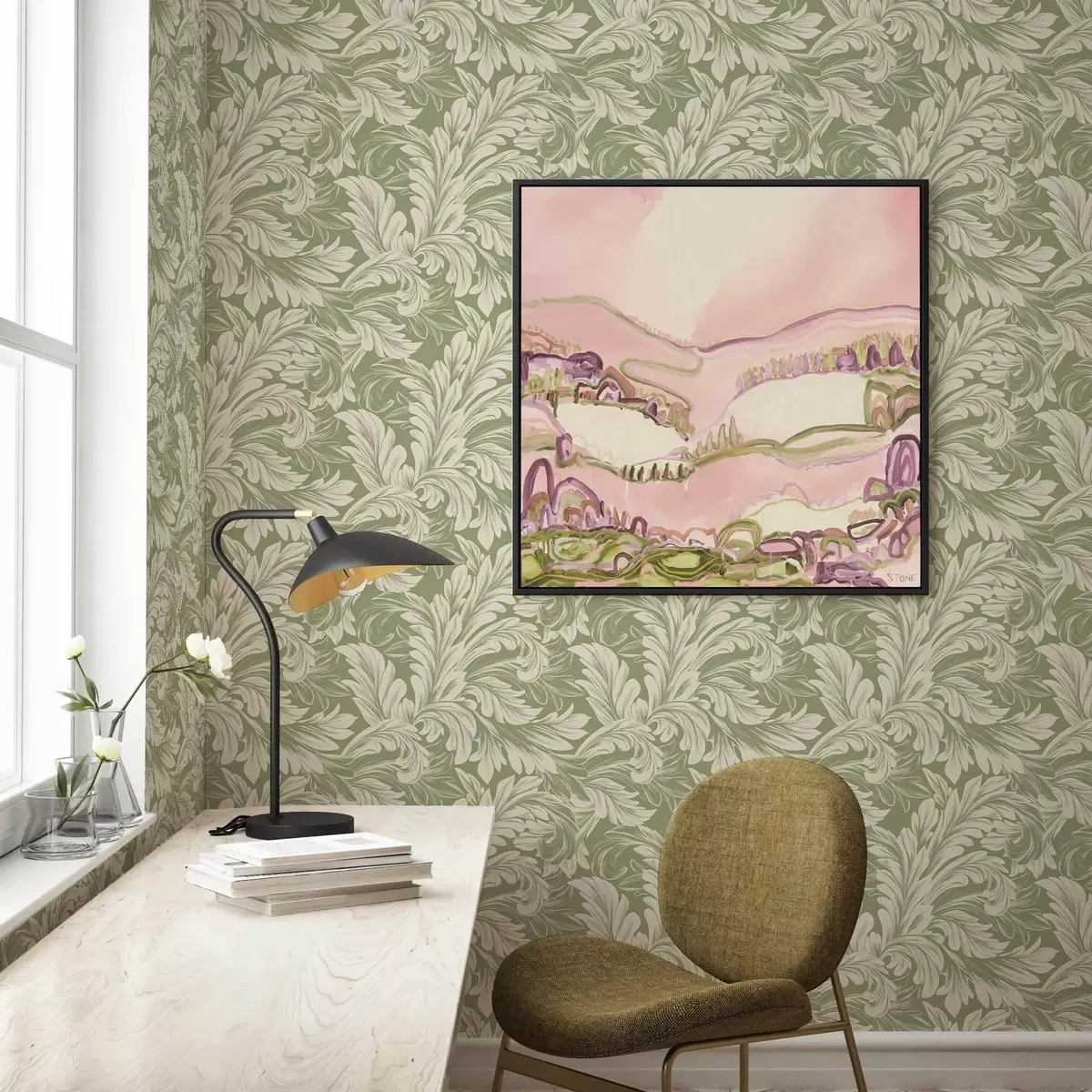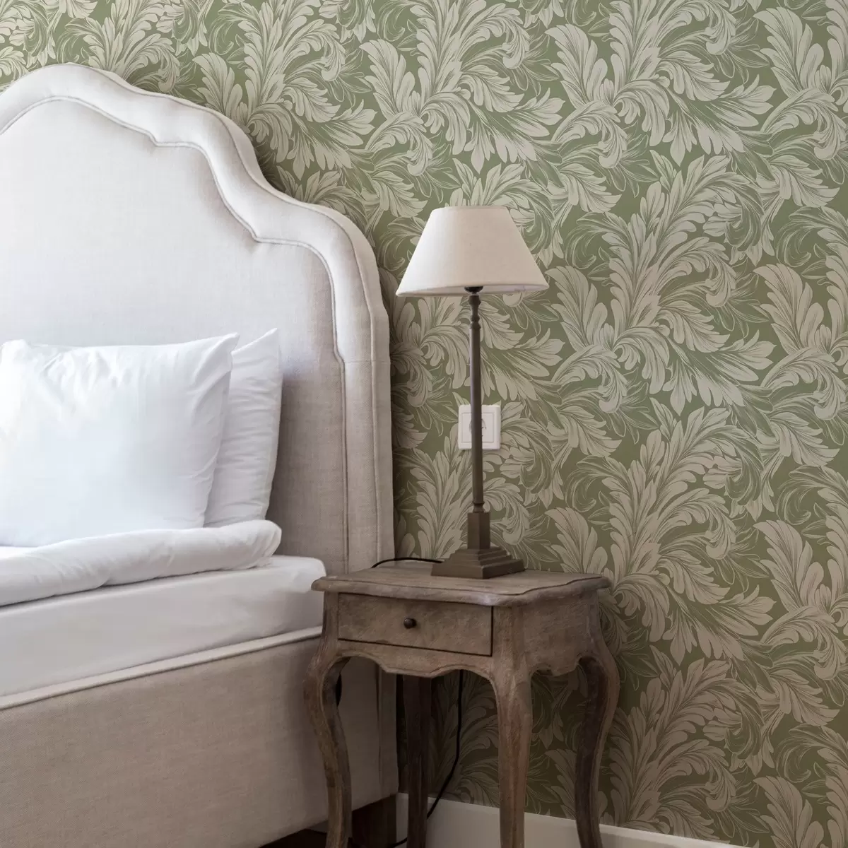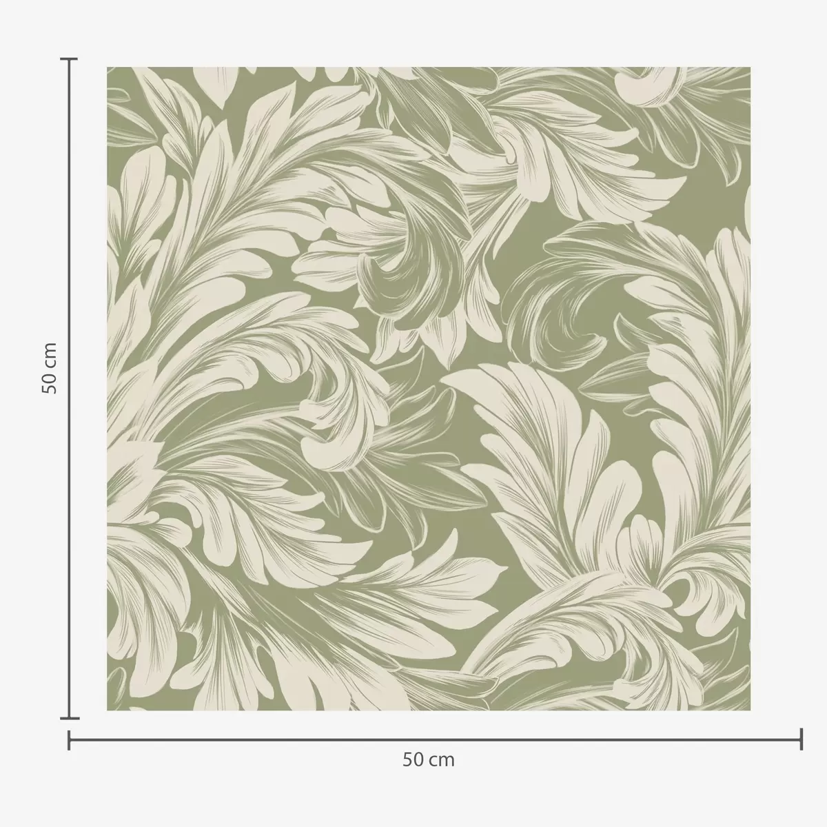 Tapetti Barokki, jossa kermanväriset lehdet vihreällä pohjalla Nr. a00135