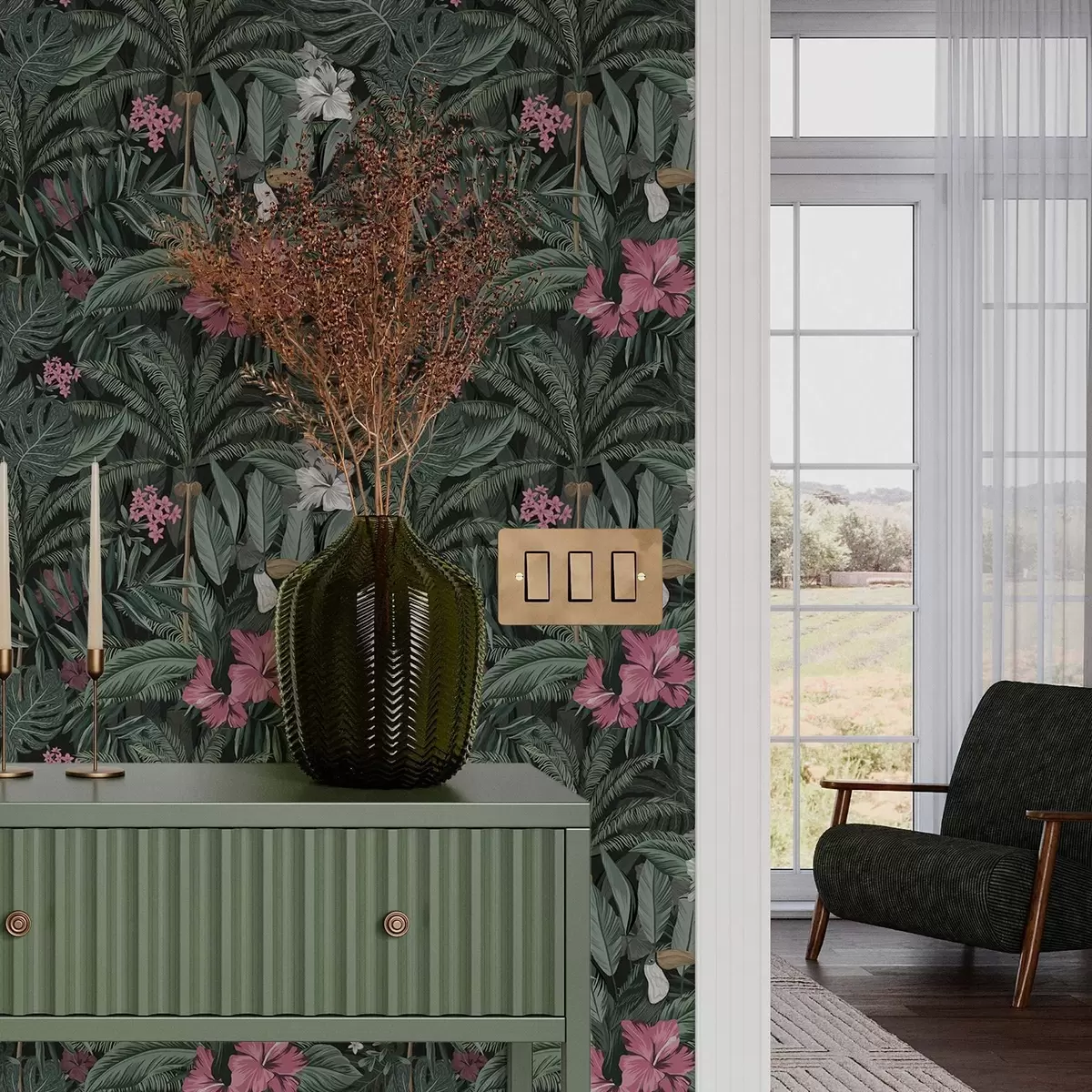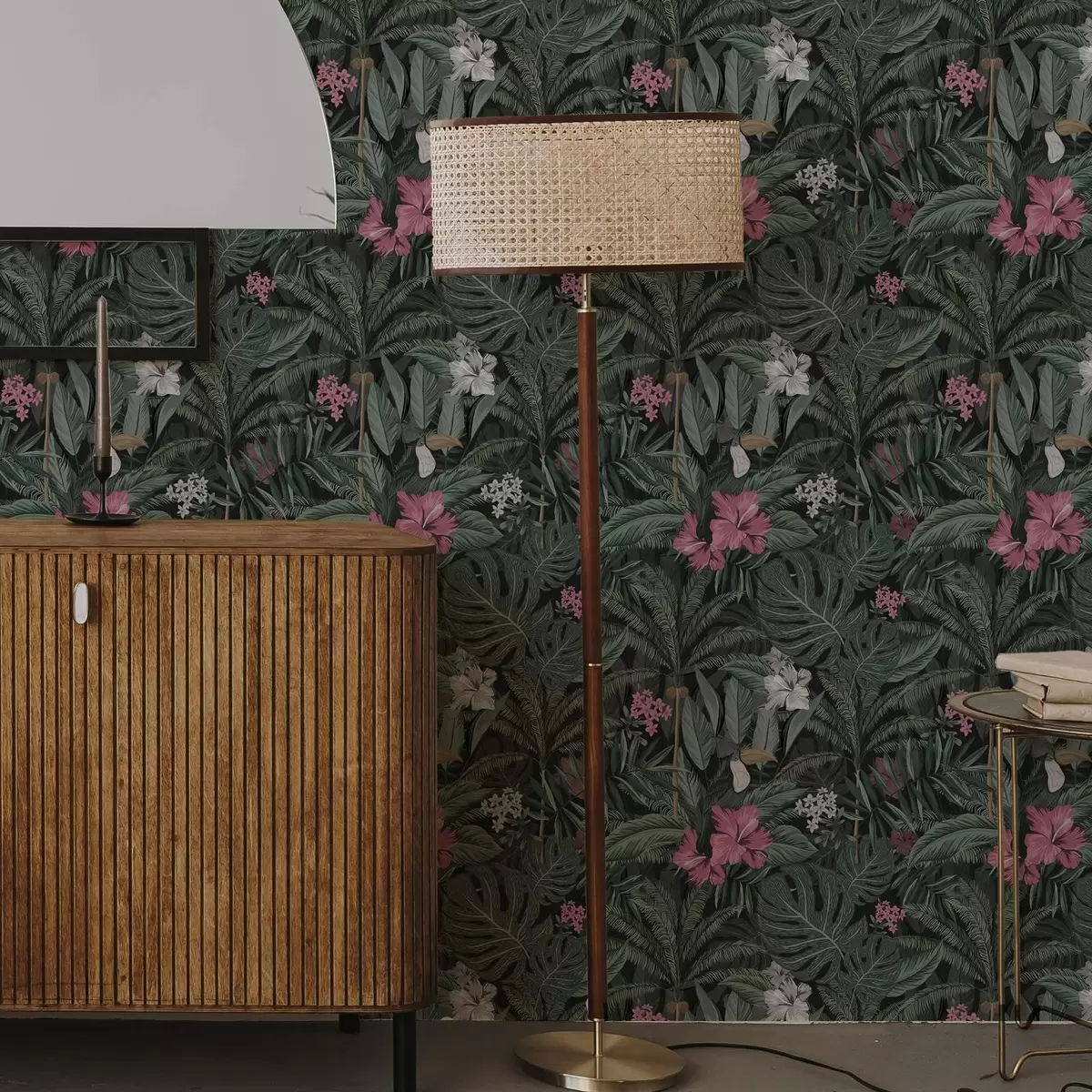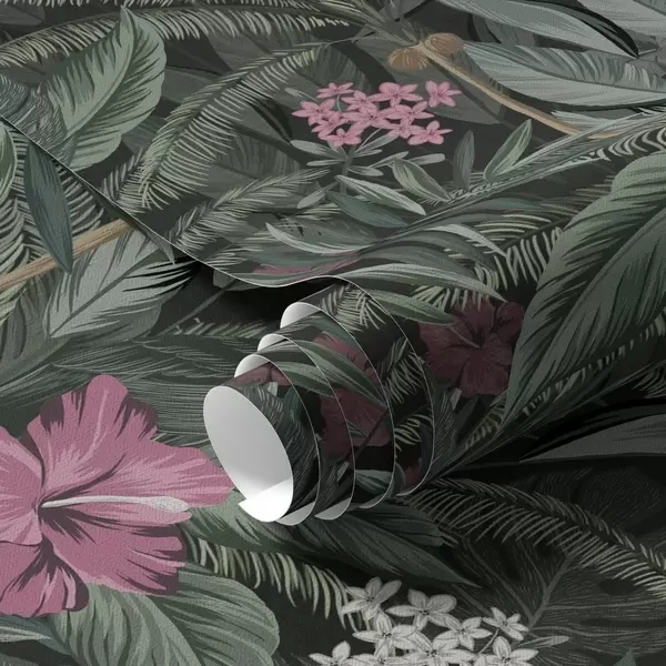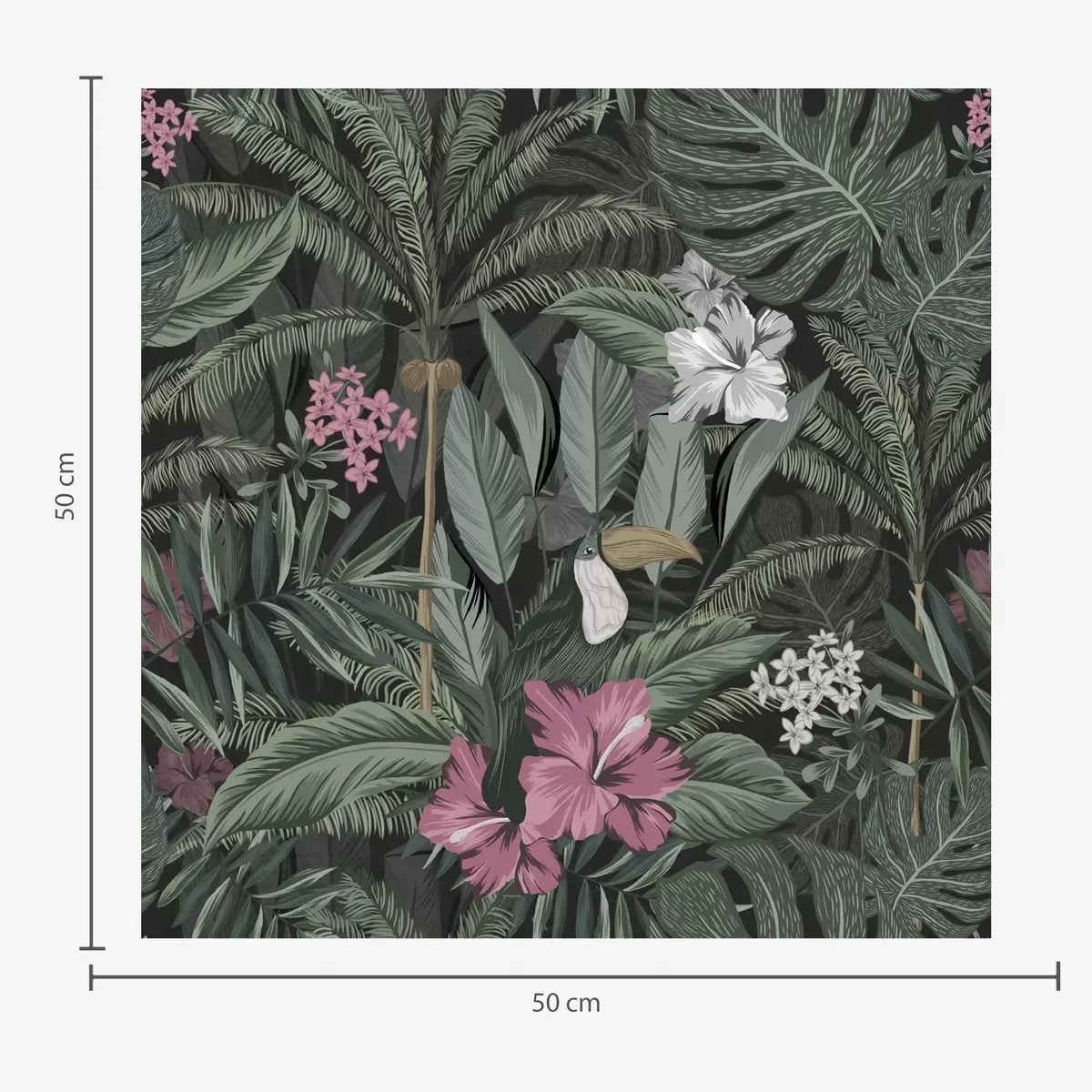 Tapetti Trooppiset lehdet ja lintu tummalla taustalla Nr. a00140