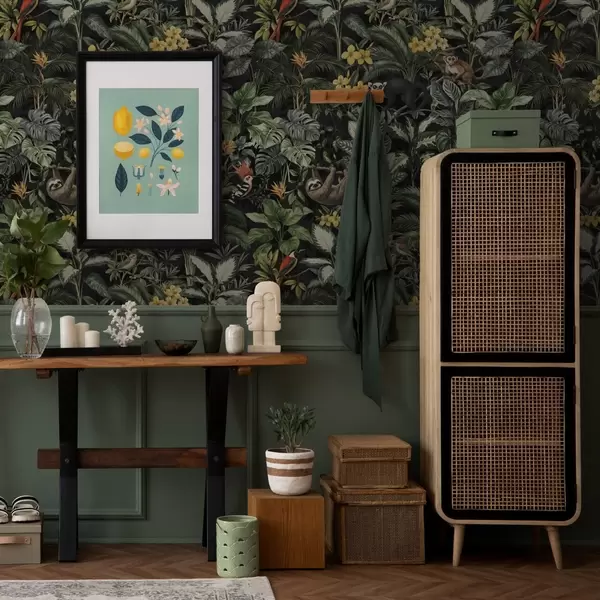 Tapetti Trooppinen viidakko, jossa on apinoita, lintuja ja tiheää lehtimetsää Nr. a00191