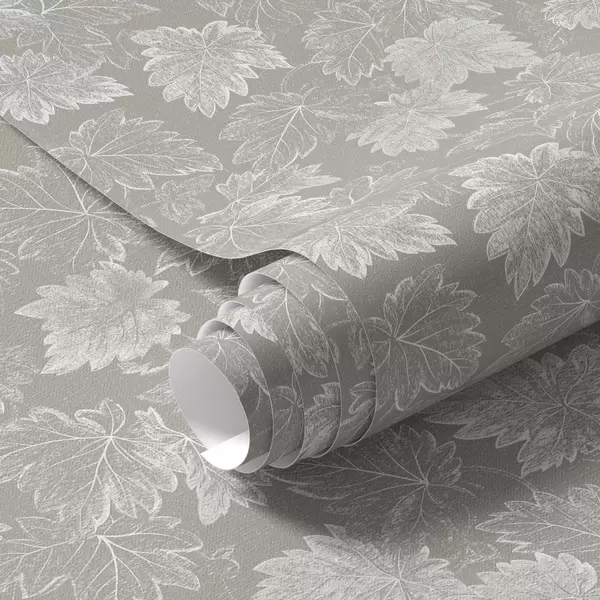 Tapetti Graafinen vaahteran lehtiä hopea värimaailma harmaalla taustalla Nr. a00196