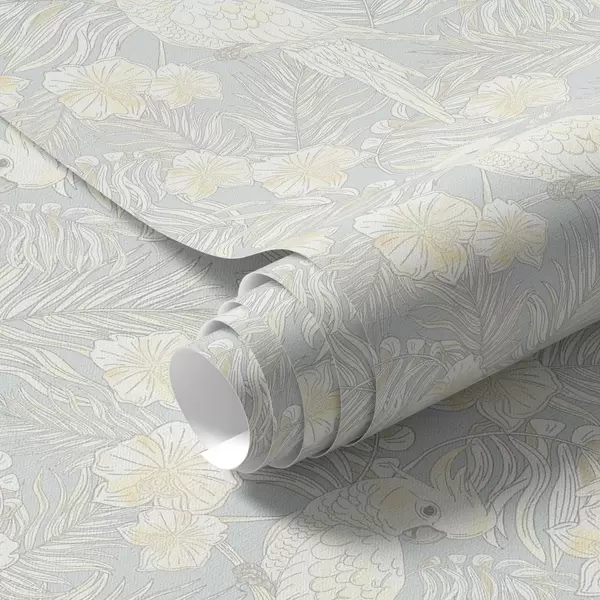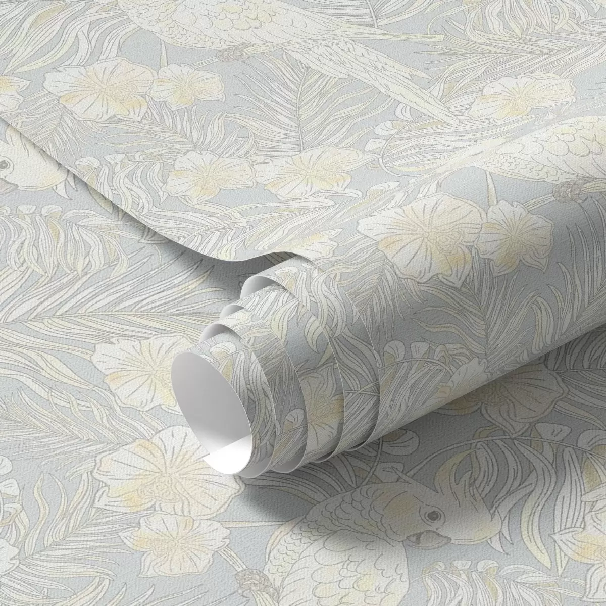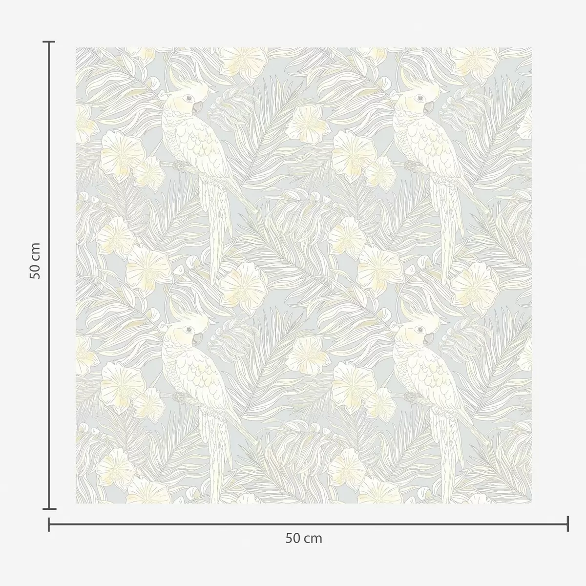 Tapetti Kevyt trooppinen painatus, jossa on kakaduja ja kukkia sinisellä pohjalla Nr. a00203