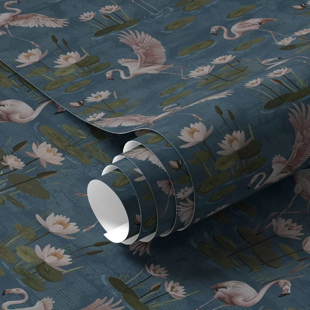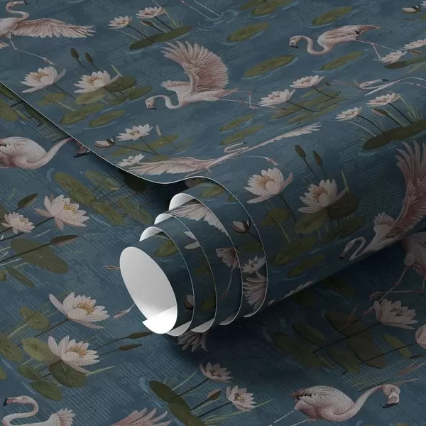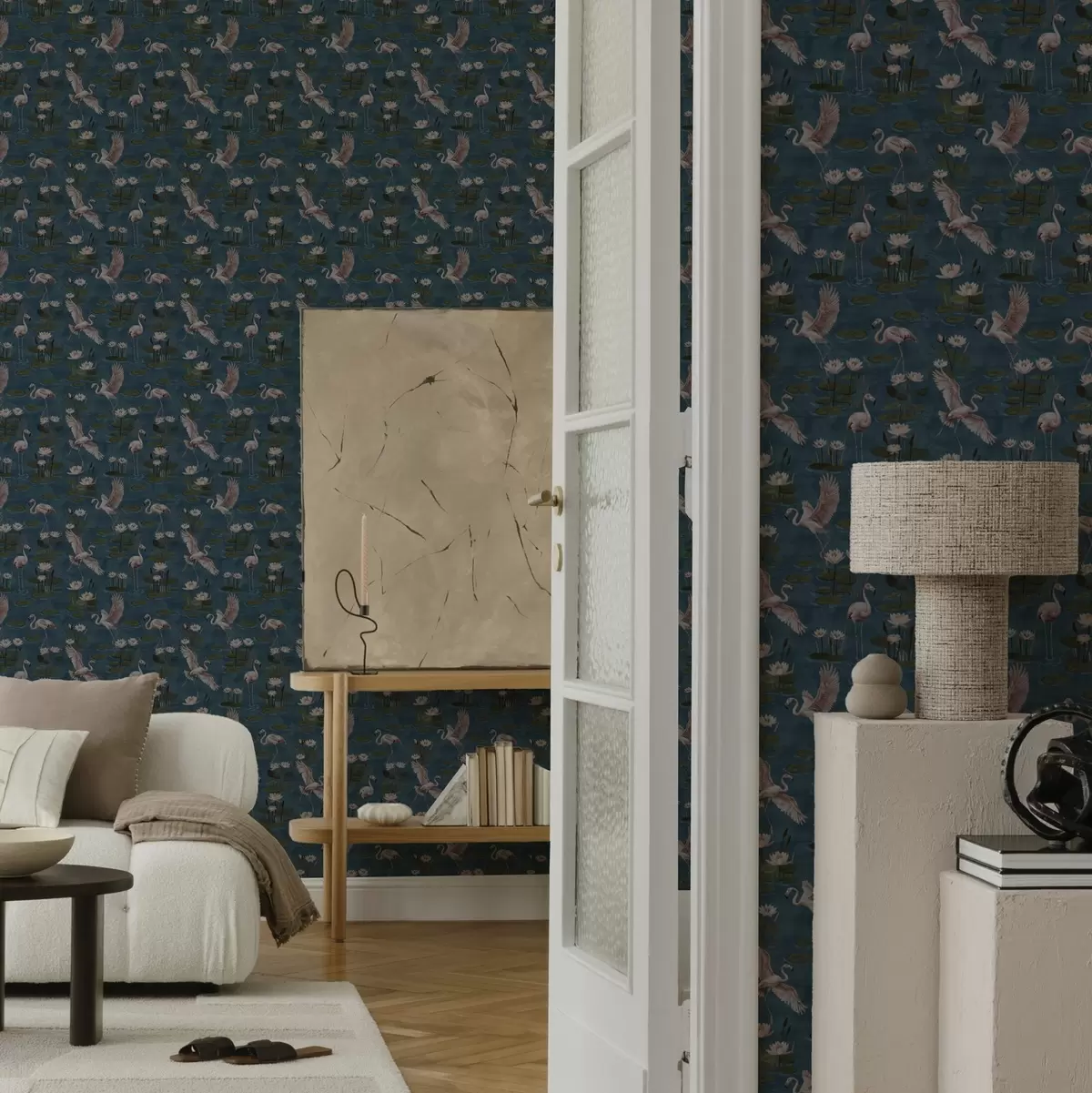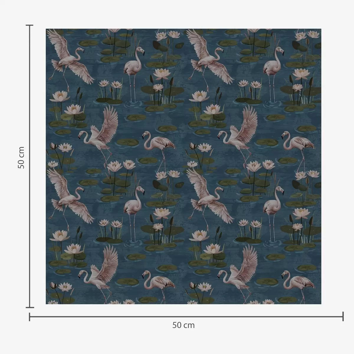 Tapetti Flamingo keskellä vesililjat, trooppinen kohtaus laivastonsininen tausta Nr. a00237