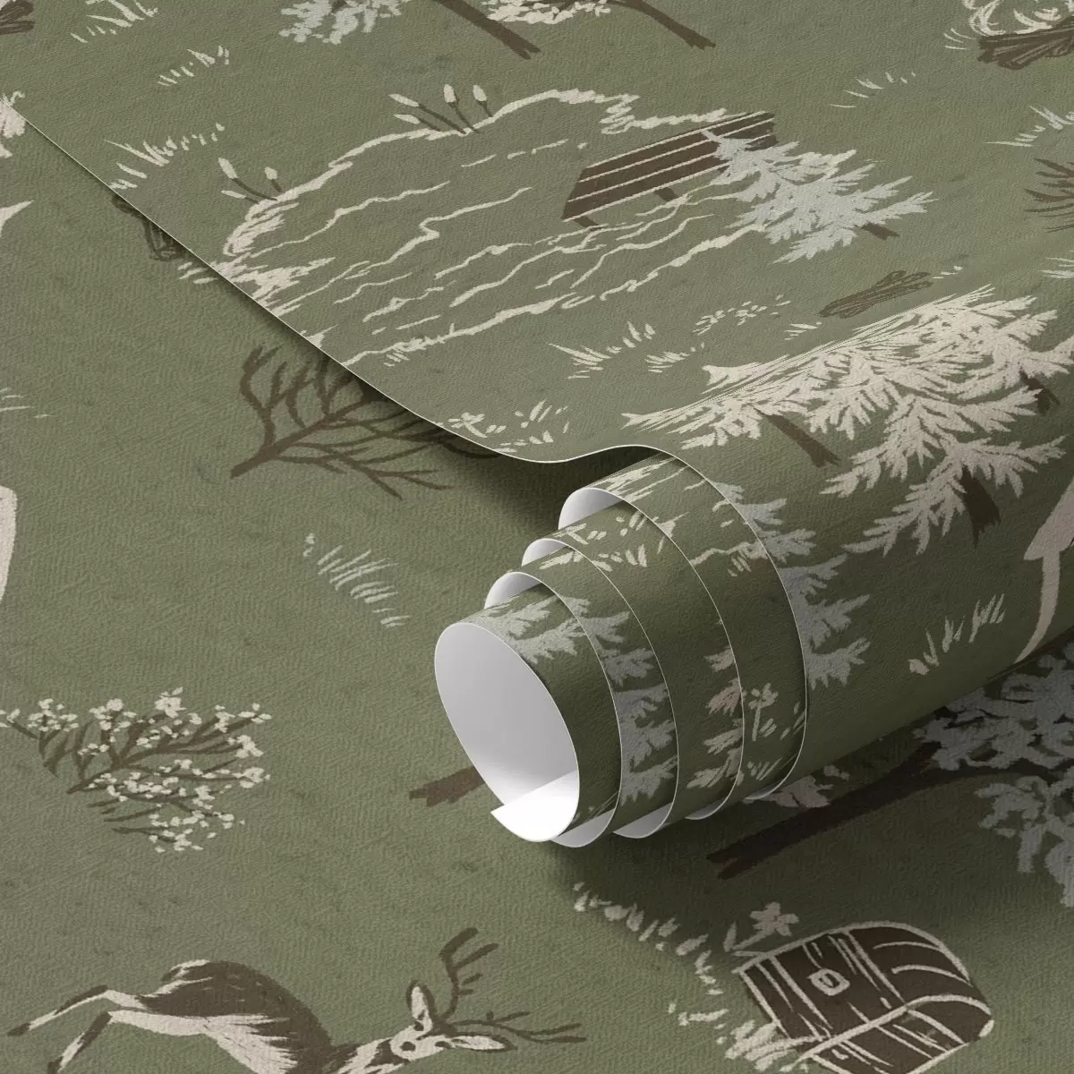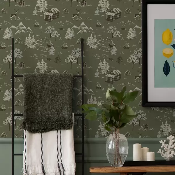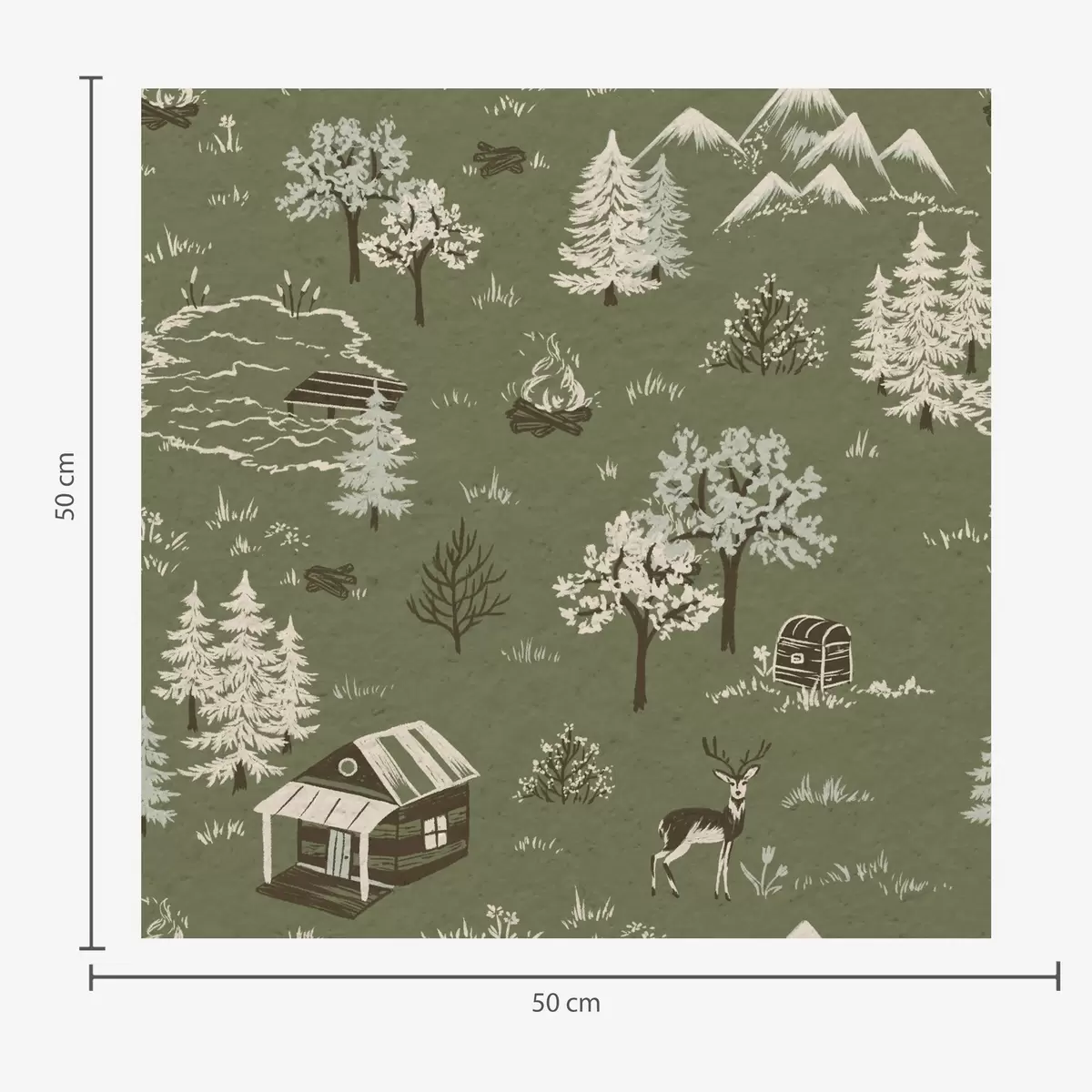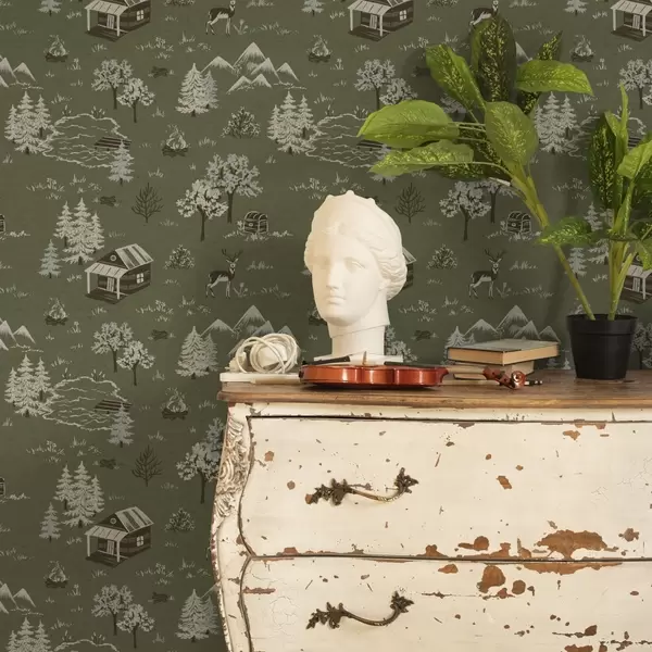 Tapetti Maalattu metsä, jossa on järvi, mökki ja eläimiä Nr. a00267