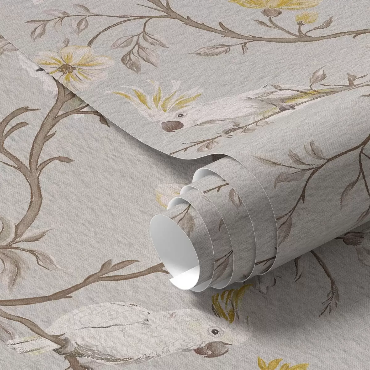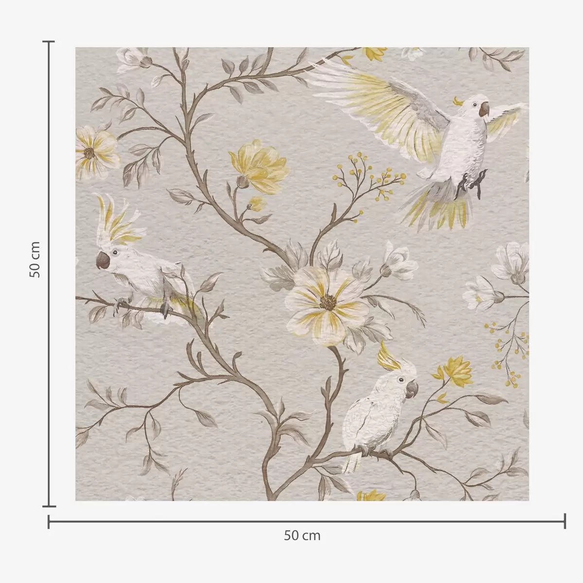 Tapetti Papukaijat ja keltaisia kukkia vaalealla taustalla Nr. a00270