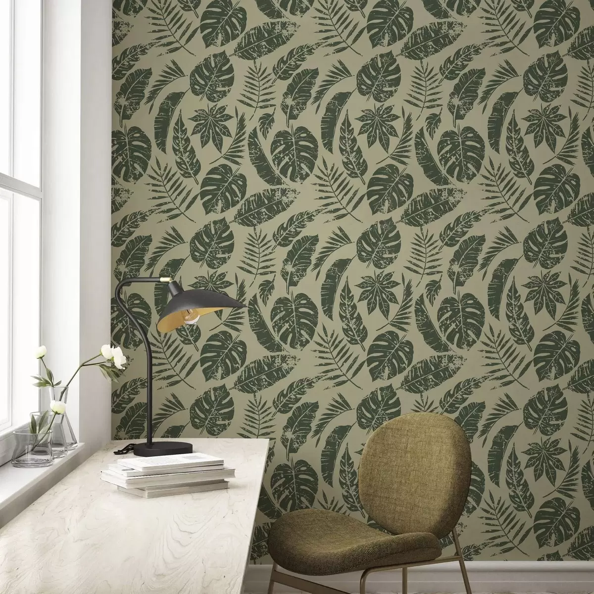 Tapetti Trooppiset lehdet linoleikkaustyyliin, vihreää keltaisella värillä Nr. a00274