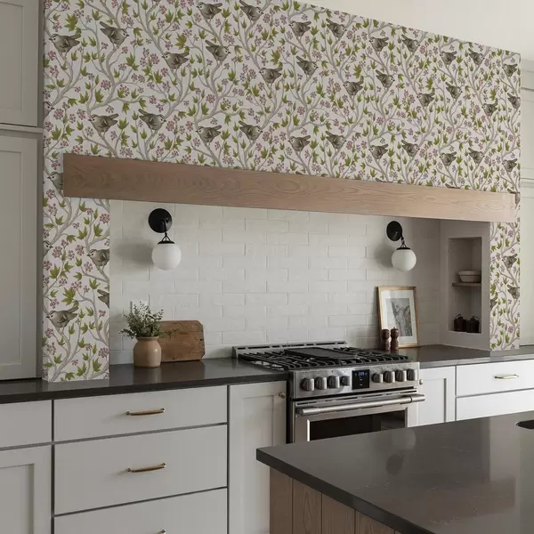 Tapetti Lintuja oksilla, joissa on lehtiä ja marjoja valkoisella pohjalla Nr. a00283