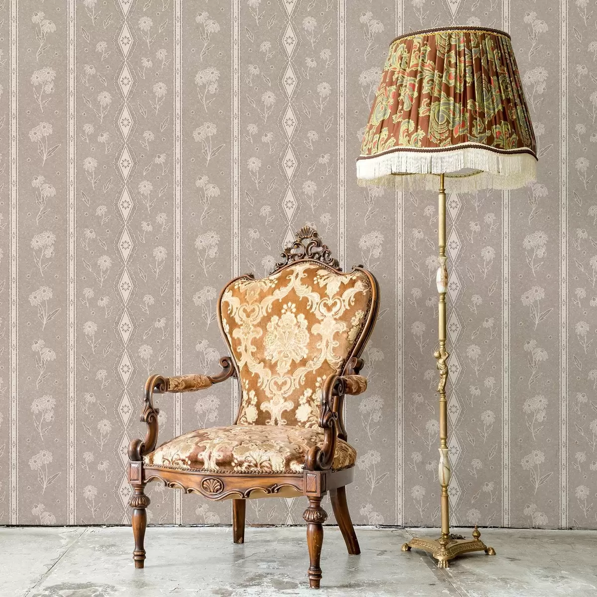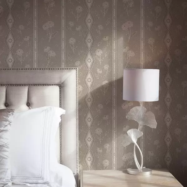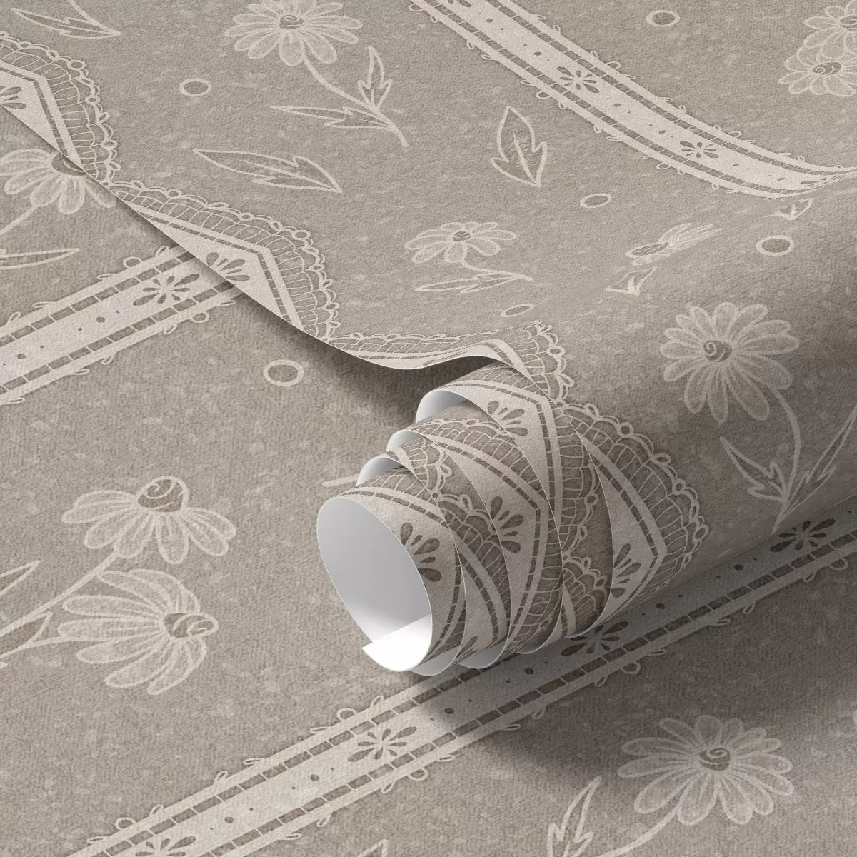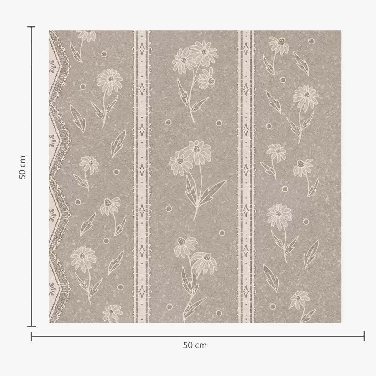 Tapetti Raidat, joissa on päivänkakkaroita ja pitsiä harmaa-beige taustalla Nr. a00295