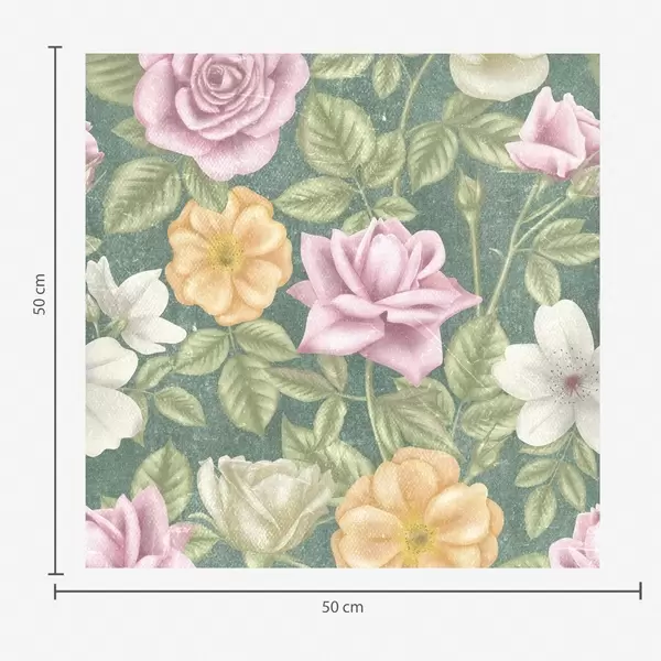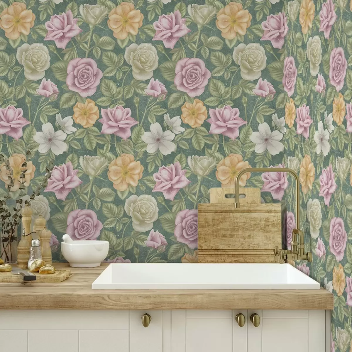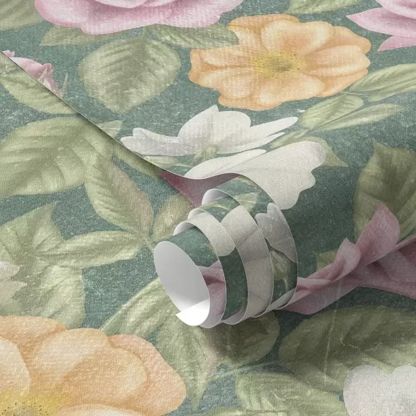 Tapetti Vaaleanpunaisia kermanvärisiä ja keltaisia ruusuja vihreällä pohjalla Nr. a00300