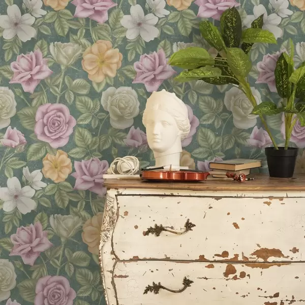 Tapetti Vaaleanpunaisia kermanvärisiä ja keltaisia ruusuja vihreällä pohjalla Nr. a00300