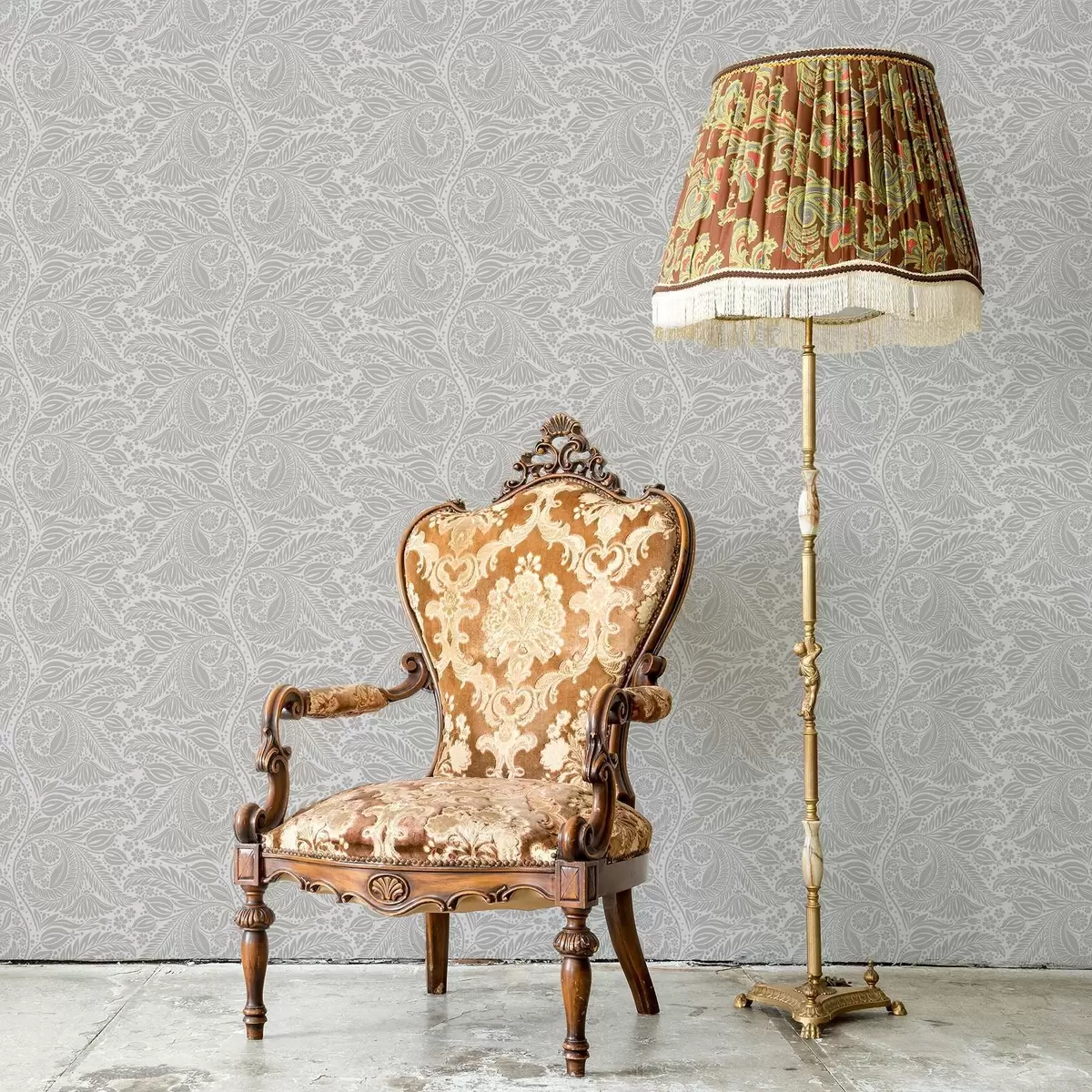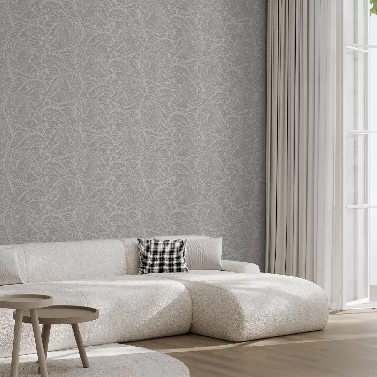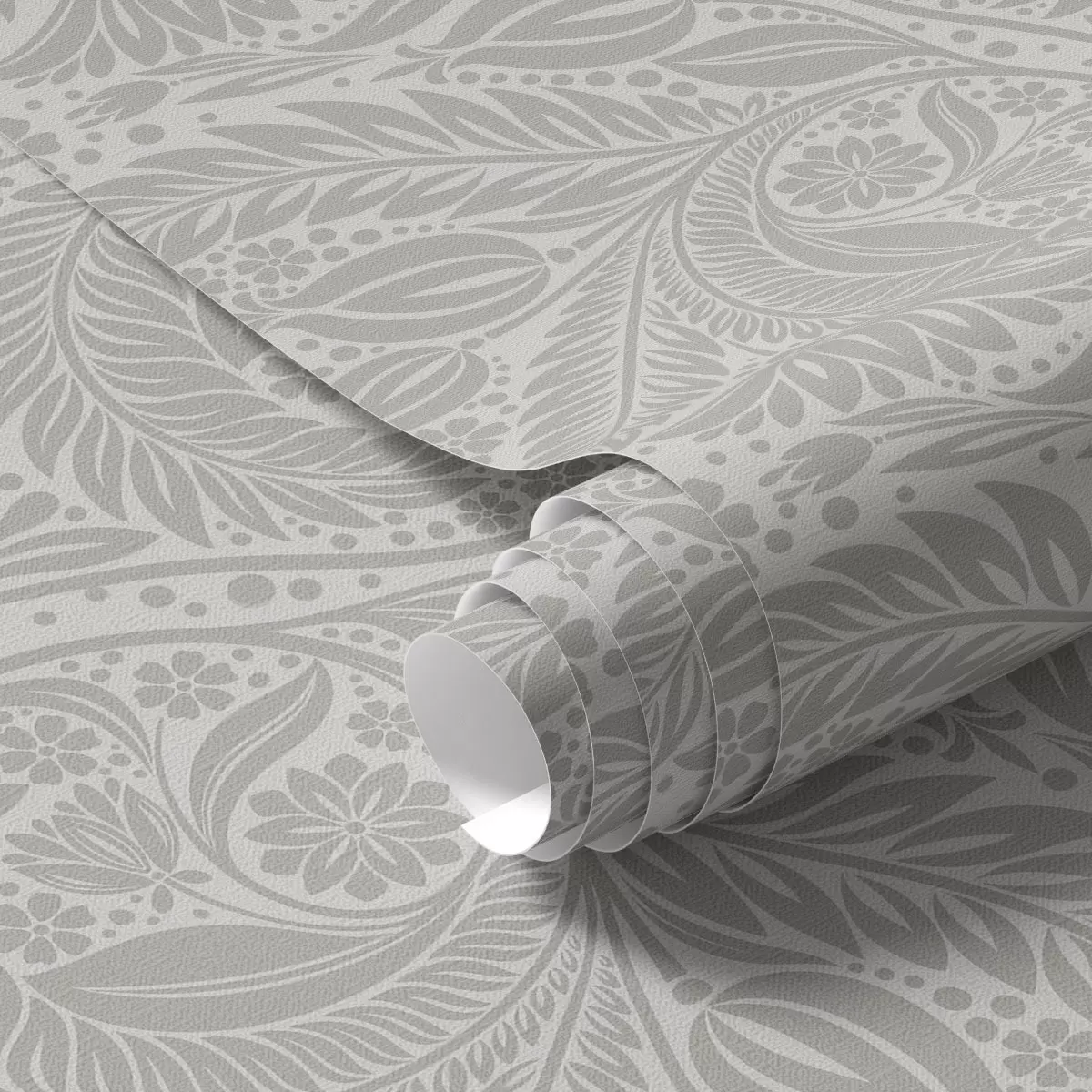 Tapetti Harmaa folkloristinen tyylittely lehtien ja kukkien kanssa Nr. a00301