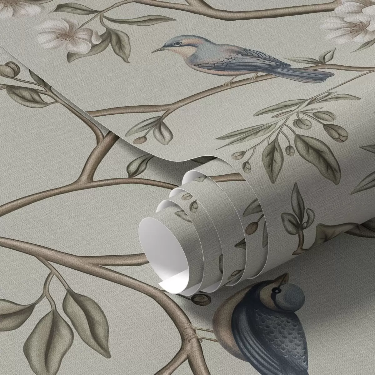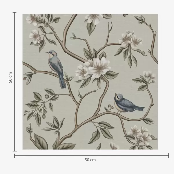 Tapetti Oksat lintujen ja valkoisten kukkien kanssa herkällä taustalla Nr. a00303