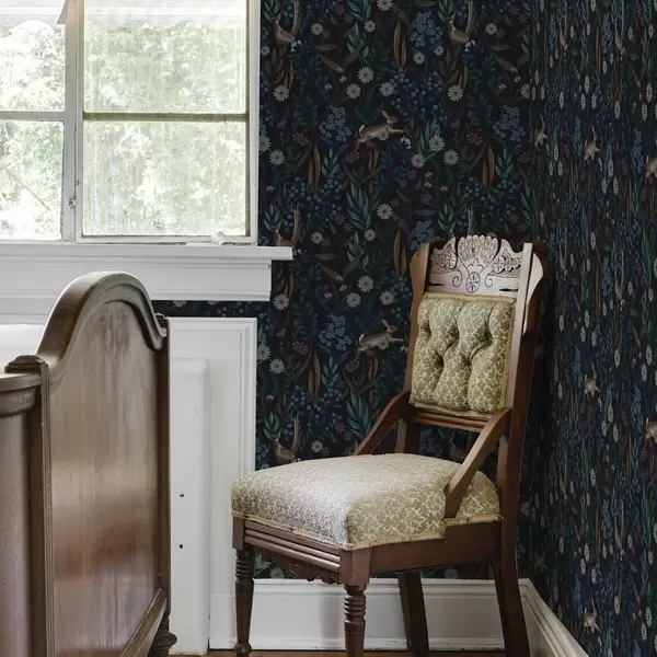 Tapetti Tumma metsä, jossa kukkia, jänis ja lintu Nr. a00310
