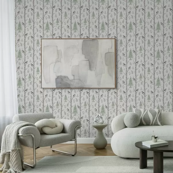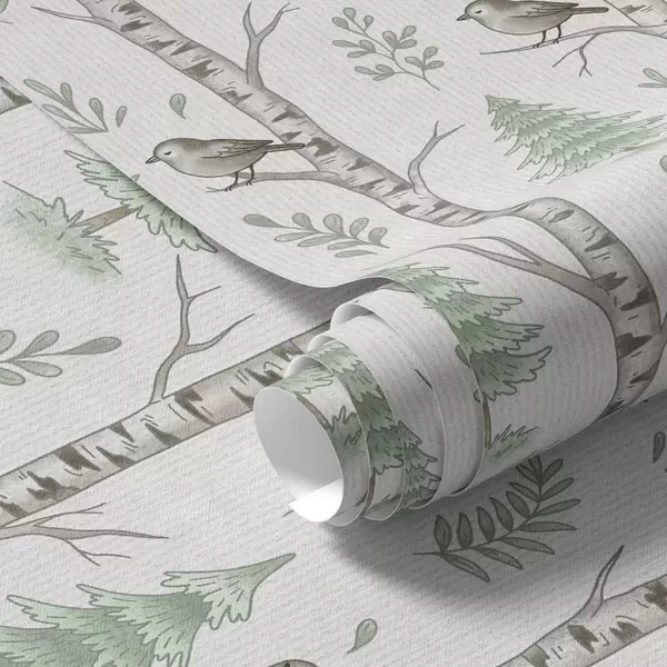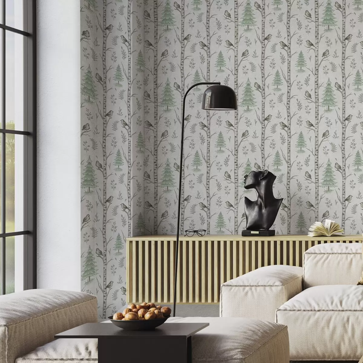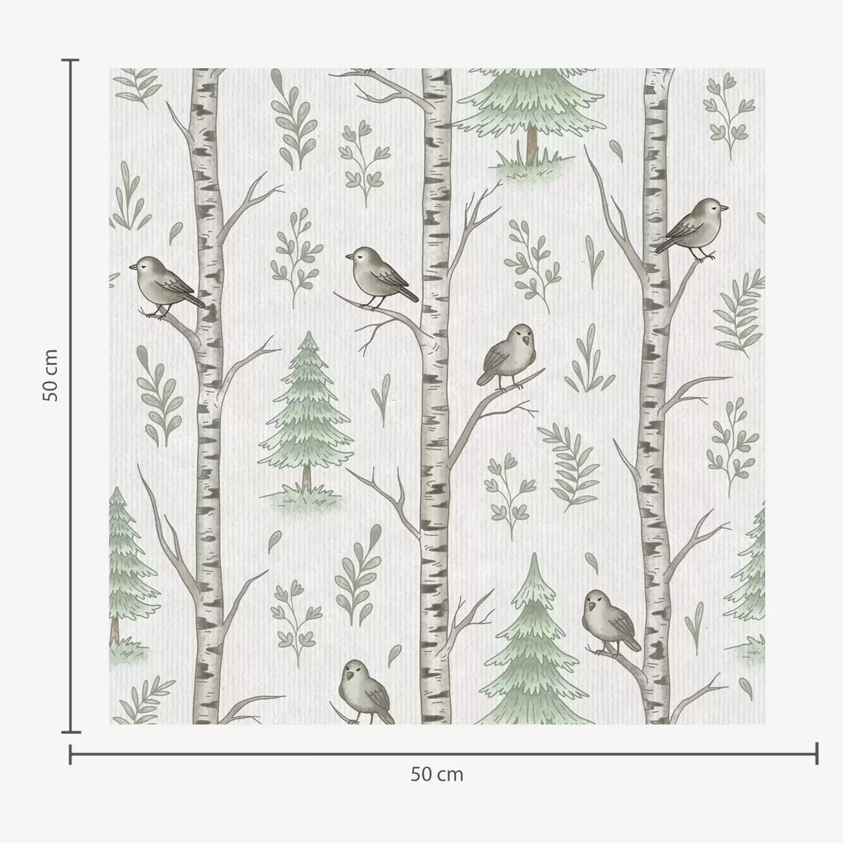 Tapetti Koivuja ja lintuja vaaleanvihreässä metsässä Nr. a00316