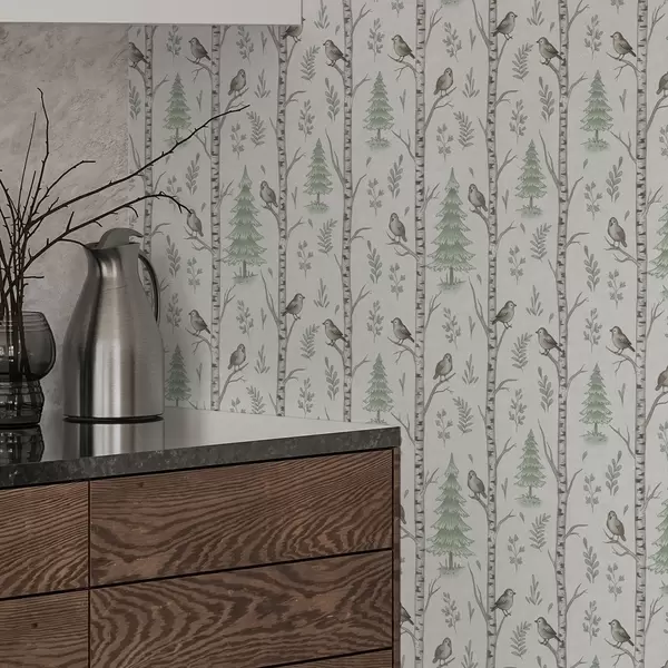 Tapetti Koivuja ja lintuja vaaleanvihreässä metsässä Nr. a00316