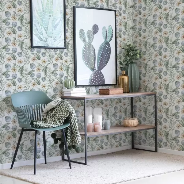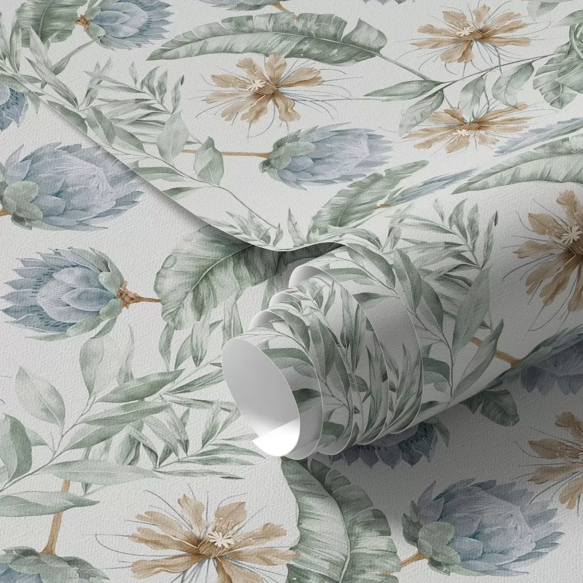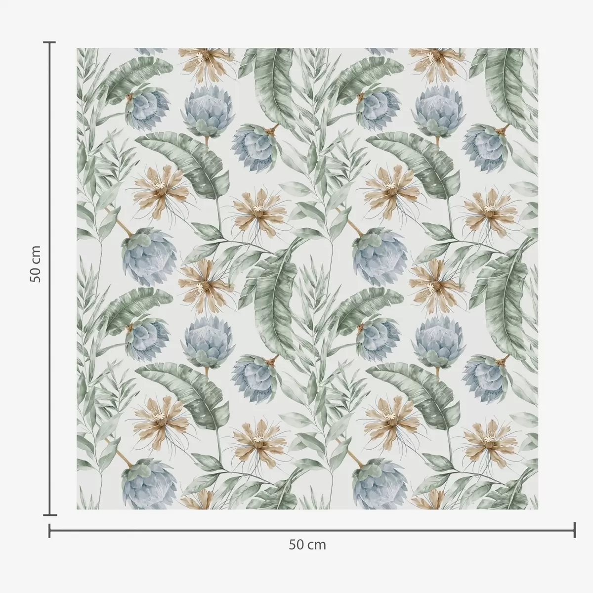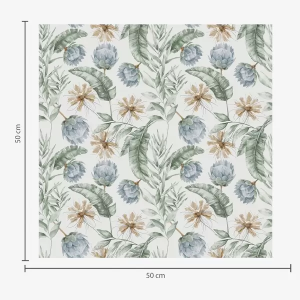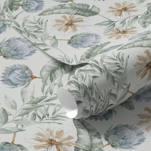 Tapetti Kasvitieteellinen kuvio, jossa on latva-artisokkia ja trooppisia lehtiä Nr. a00340