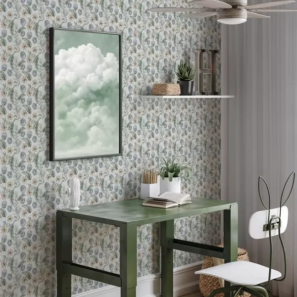 Tapetti Kasvitieteellinen kuvio, jossa on latva-artisokkia ja trooppisia lehtiä Nr. a00340