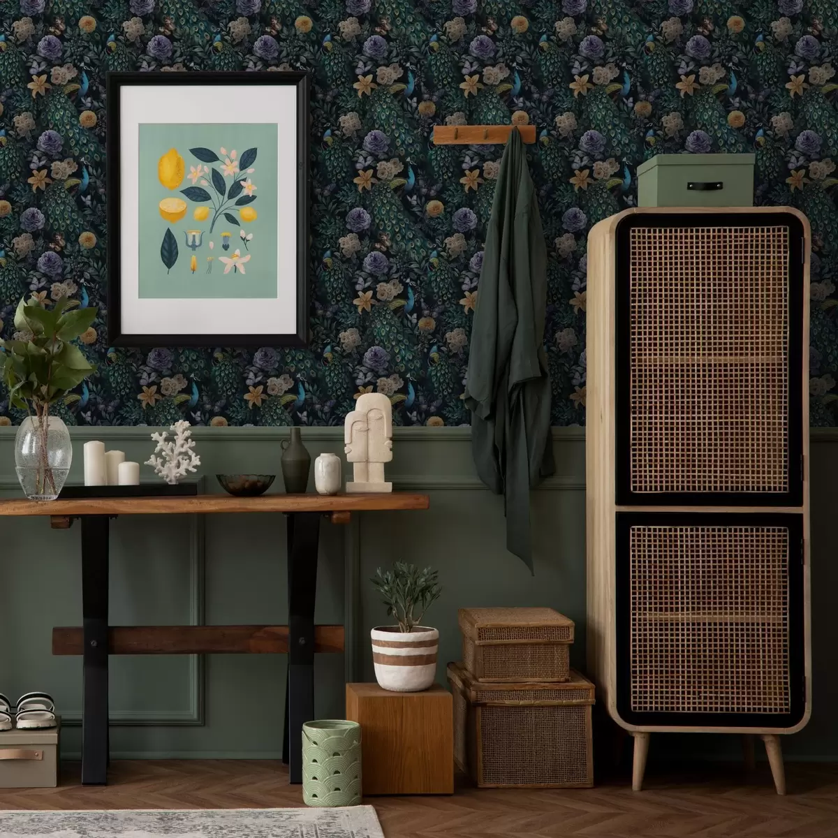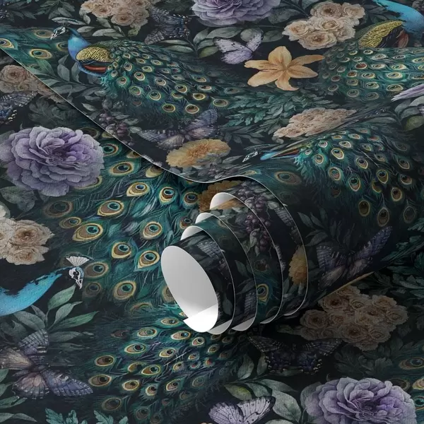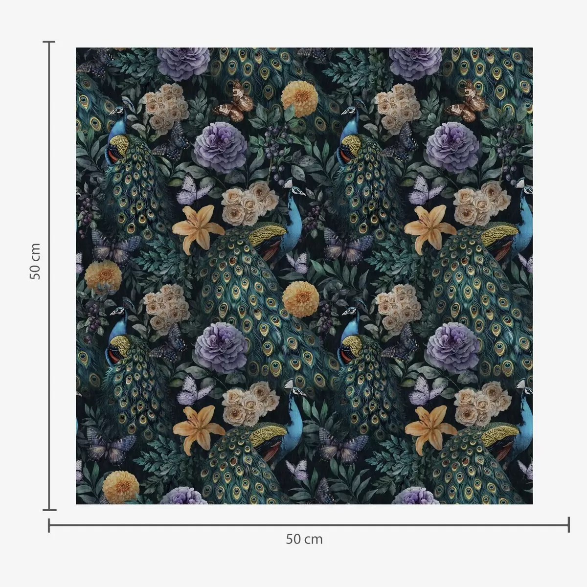 Tapetti Riikinkukkoja tummien kukkien ja perhosten keskellä Nr. a00348