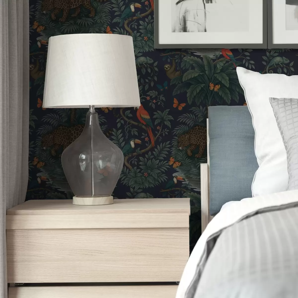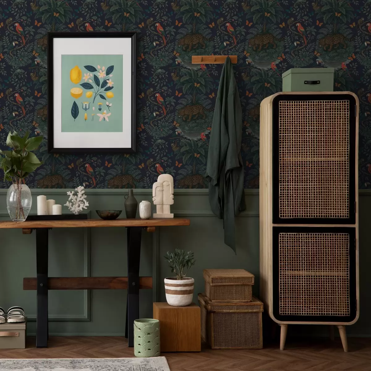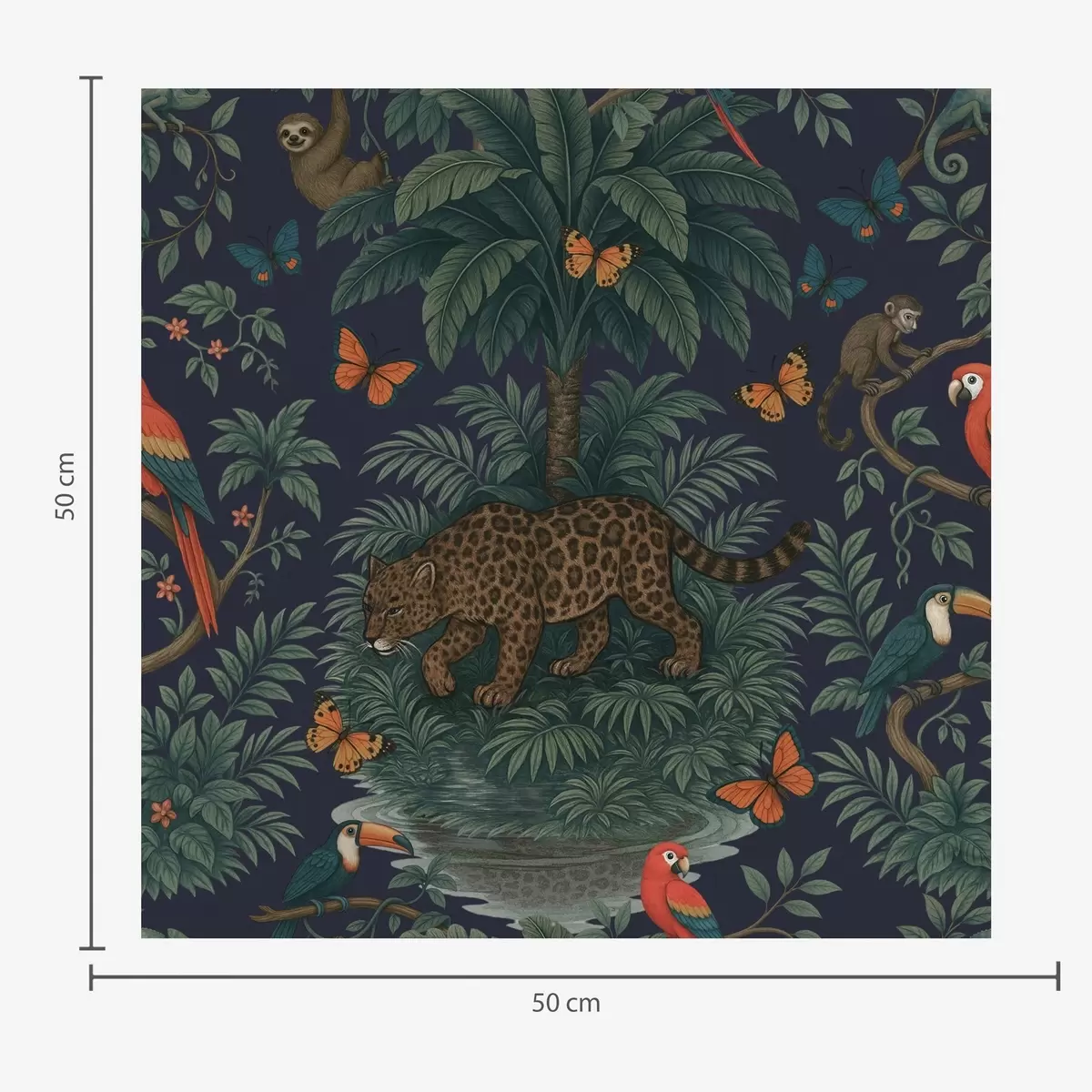 Tapetti Trooppinen viidakko leopardin, leopardin, papukaijojen ja perhosten kanssa Nr. a00388