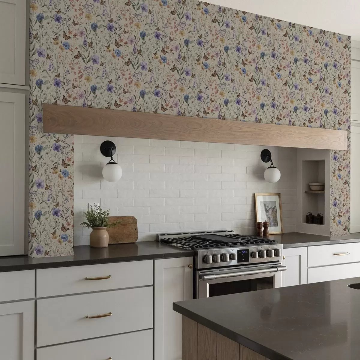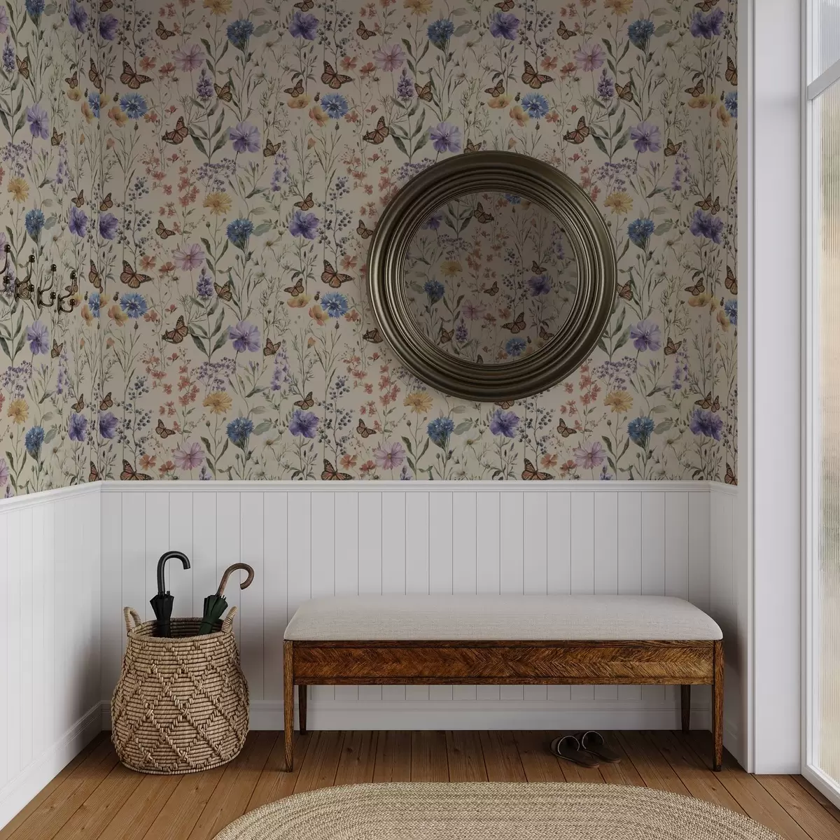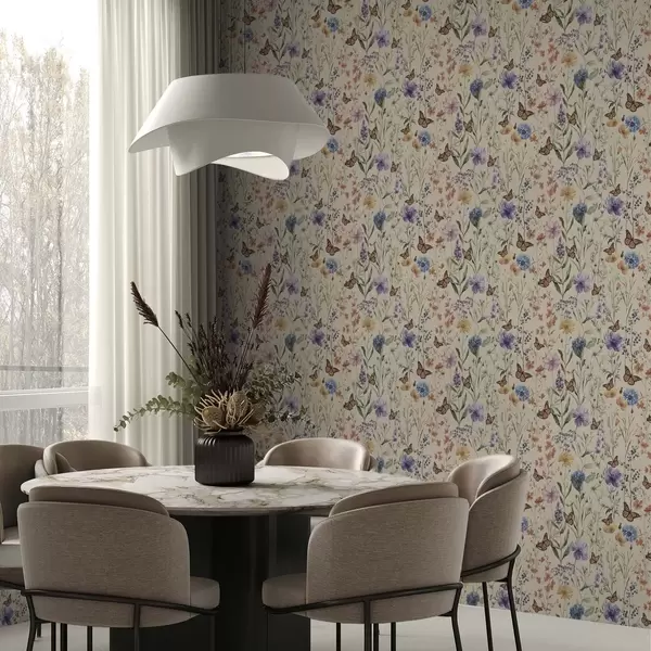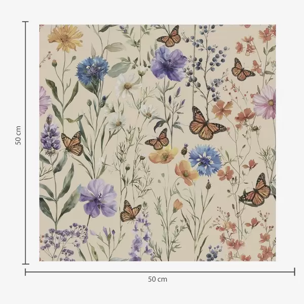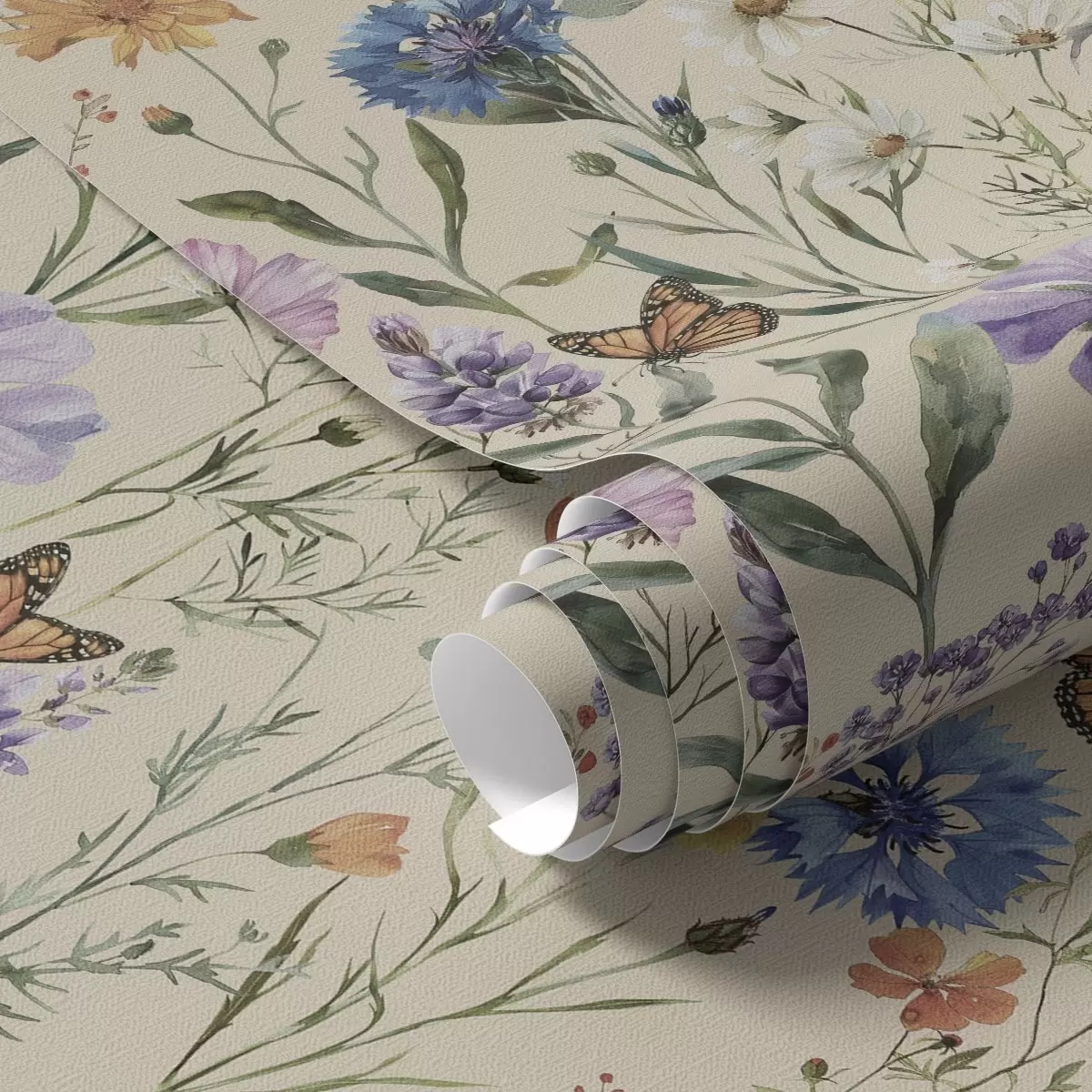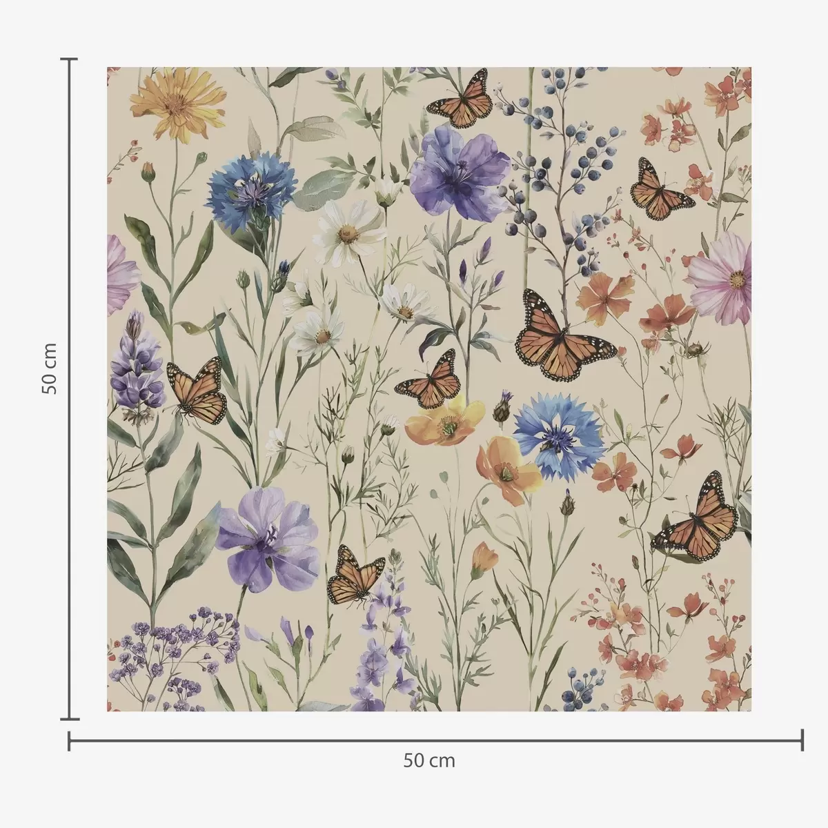 Tapetti Luonnonkukkia ja perhosia pehmeällä vesivärityylillä Nr. a00389