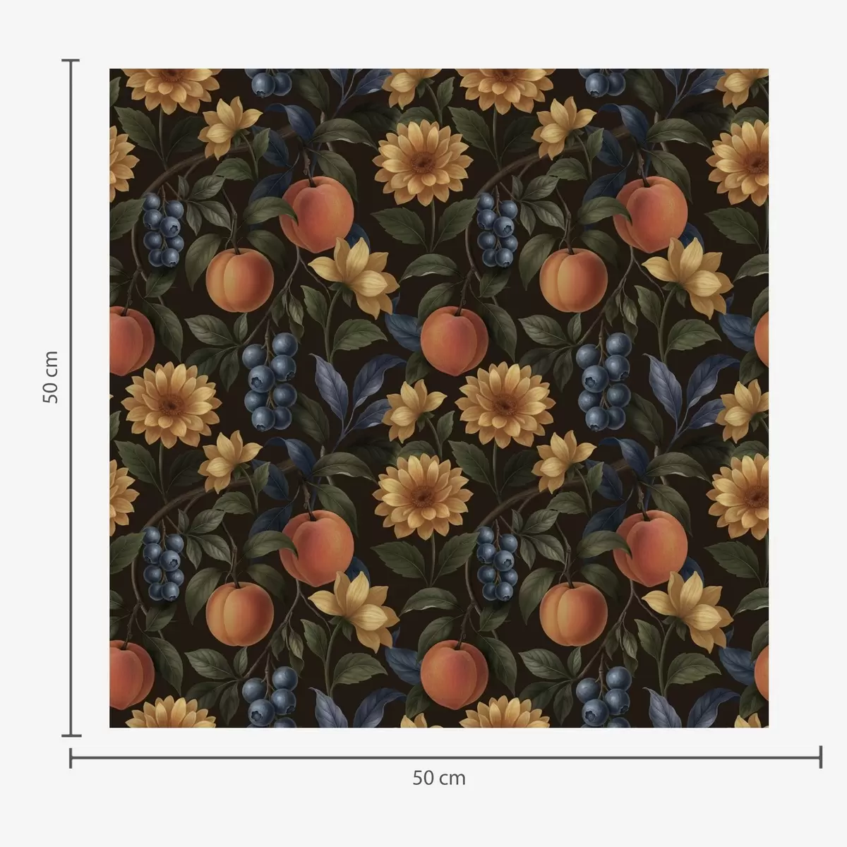 Tapetti Hedelmät ja keltaiset kukat tummalla kasvitieteellisellä taustalla Nr. a00395