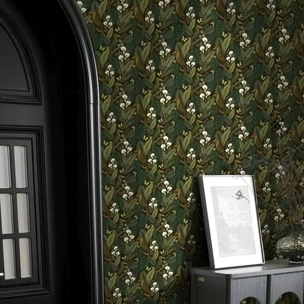Tapetti Trooppisia lintuja ja rehevää vehreyttä tummalla viidakkotaustalla Nr. a00397