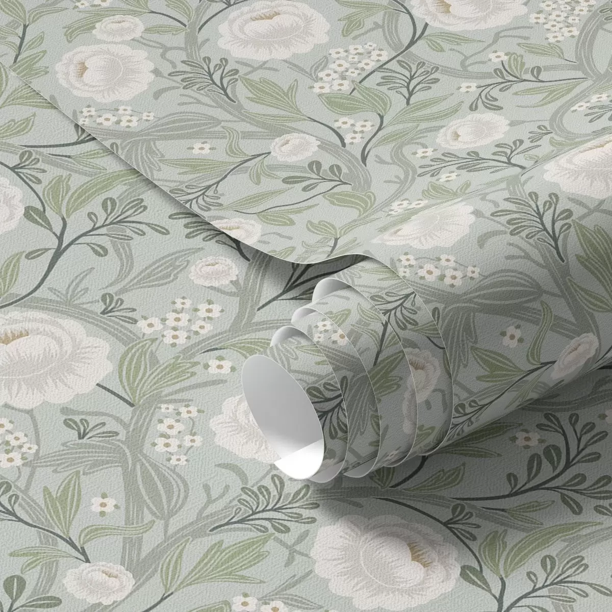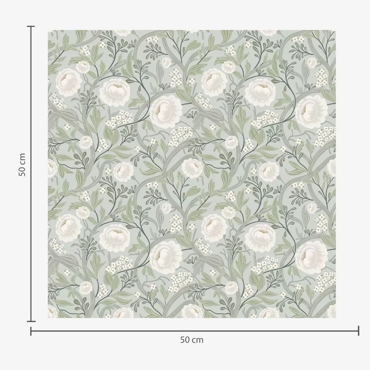 Tapetti Lempeät vihreät lehdet ja kermanväriset kukat, vihreät lehdet ja kermanväriset kukat, joissa on siro viiniköynnös Nr. a00398