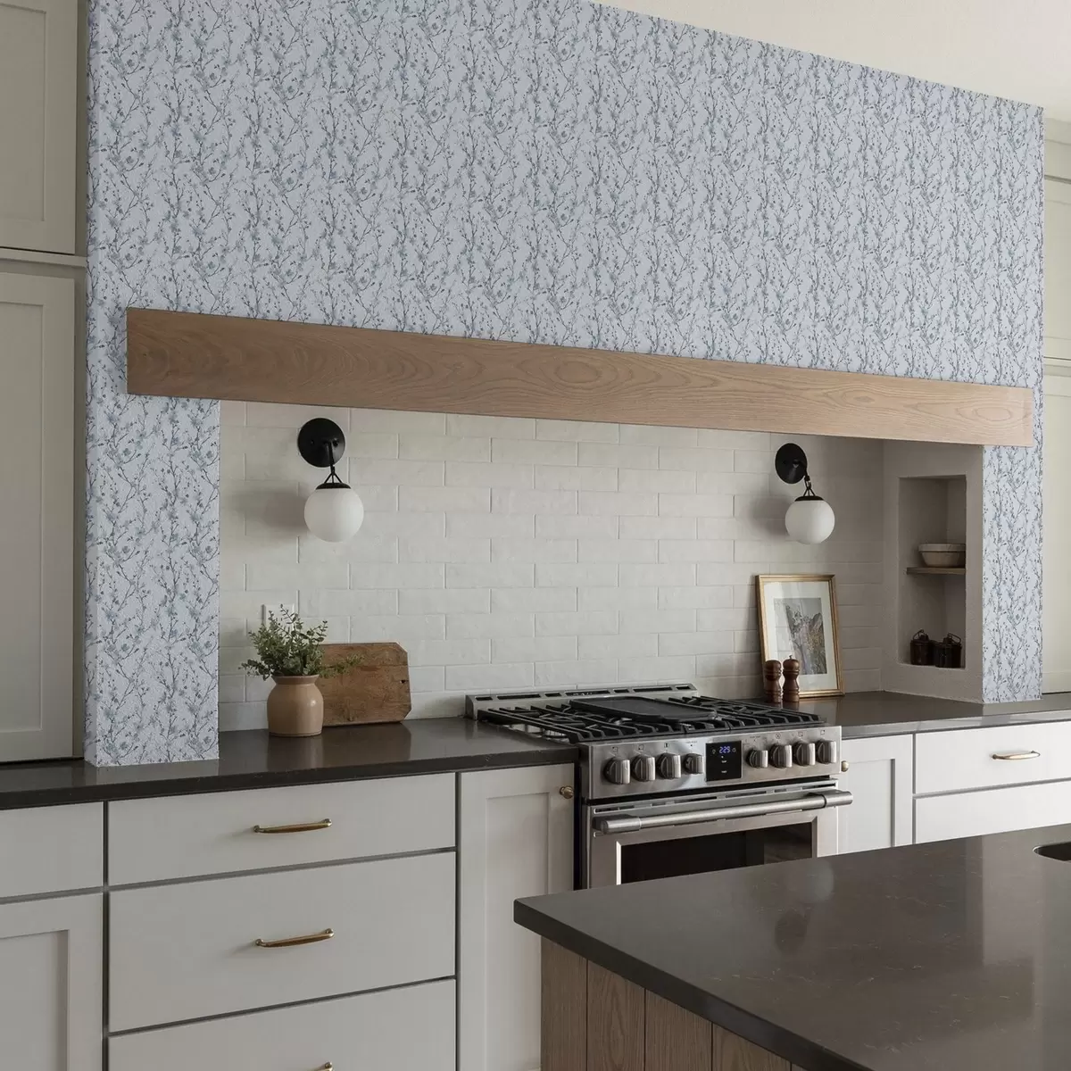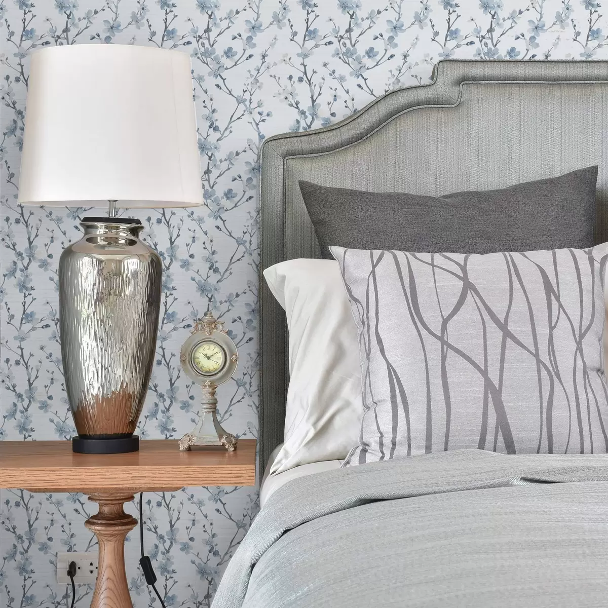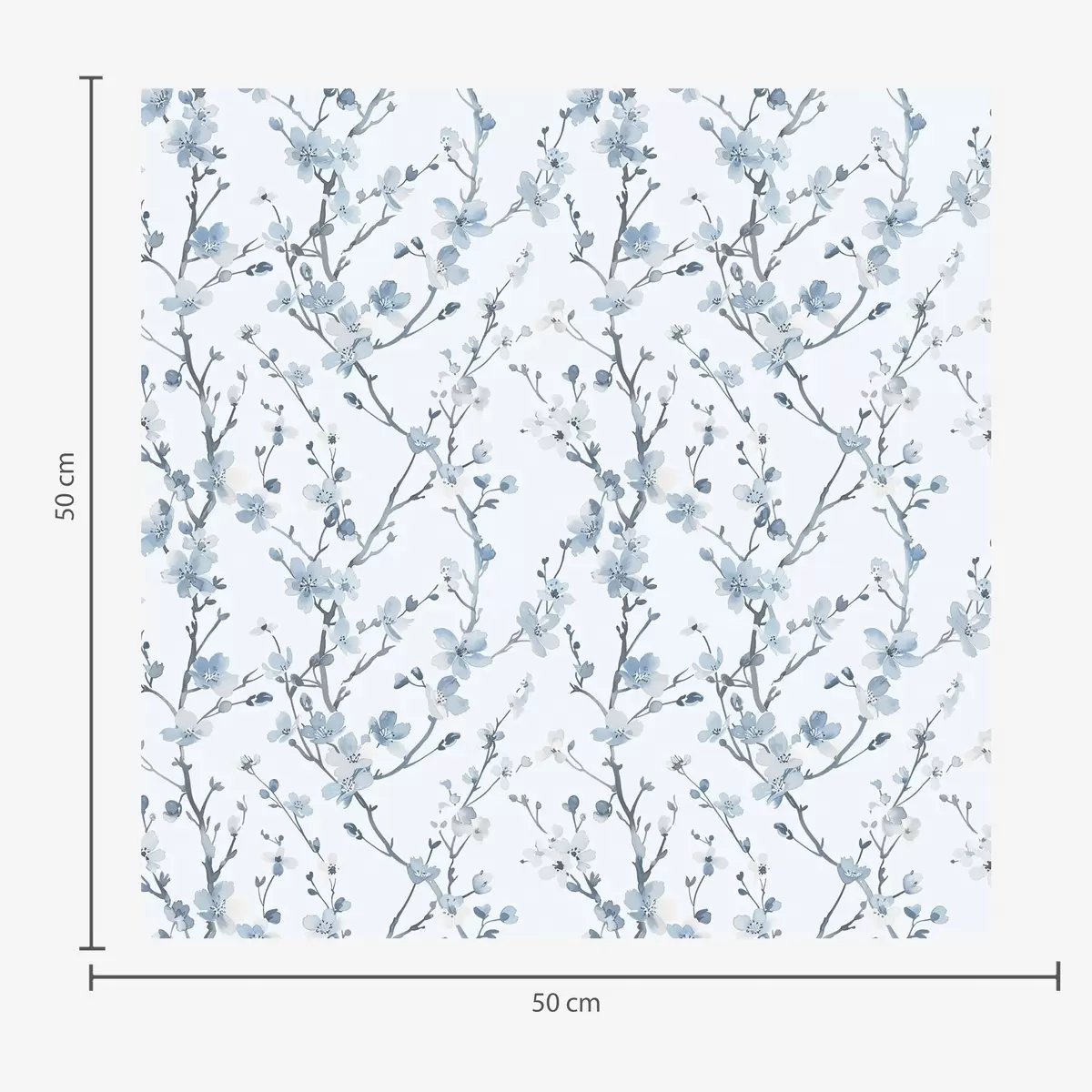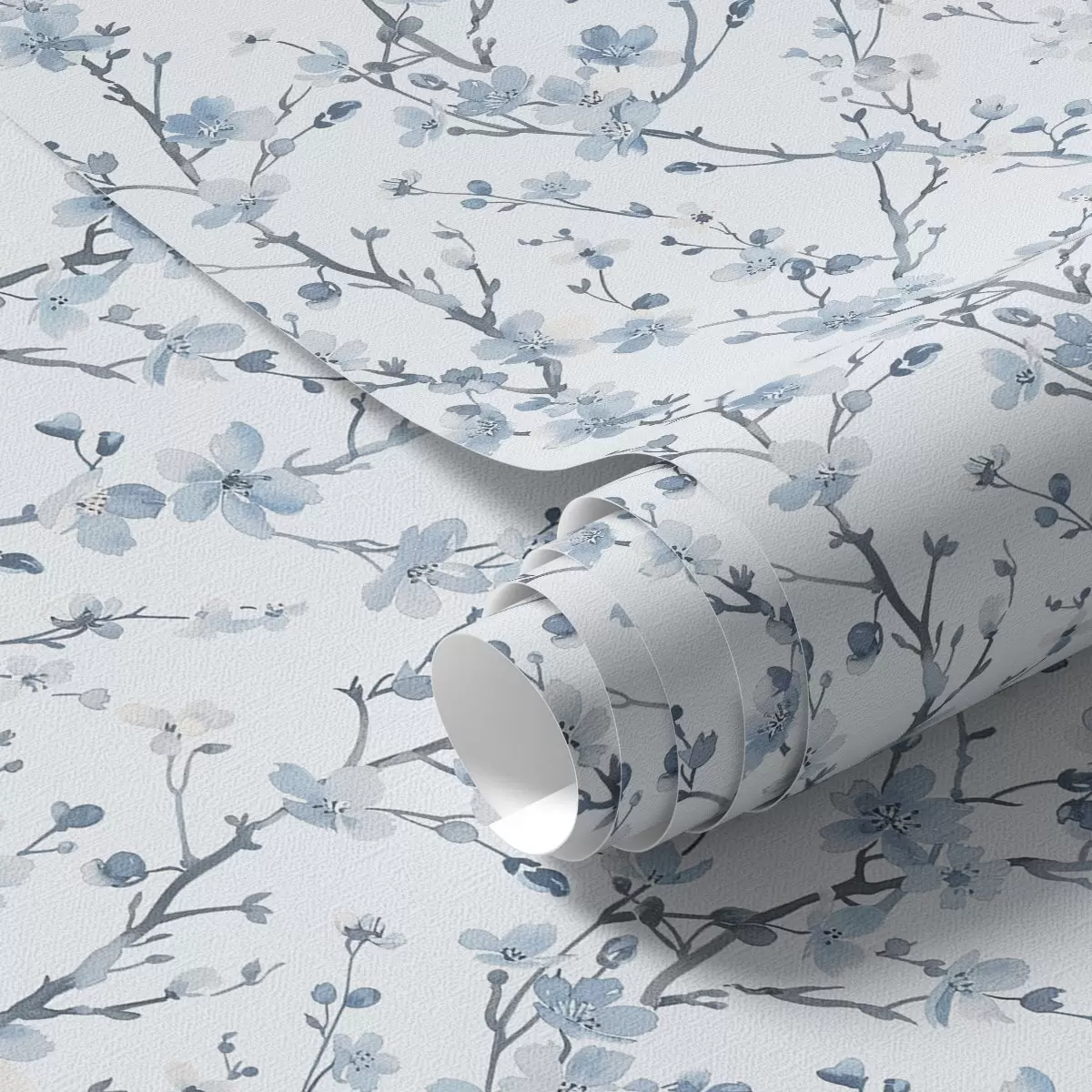 Tapetti Sinisiä kirsikankukkia valkoisella taustalla pehmeällä kontrastilla Nr. a00399