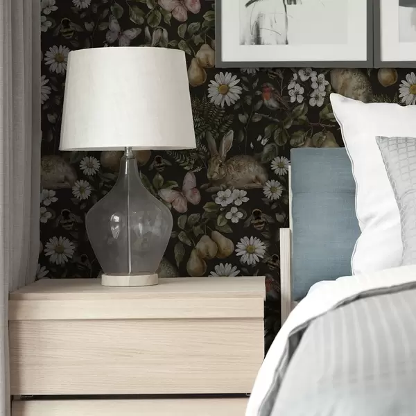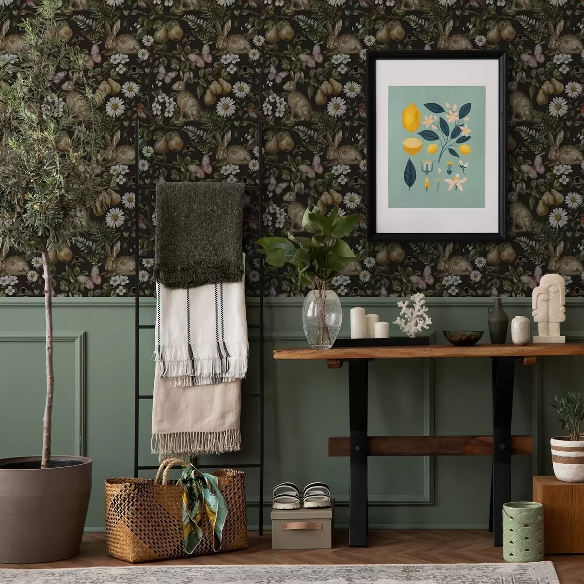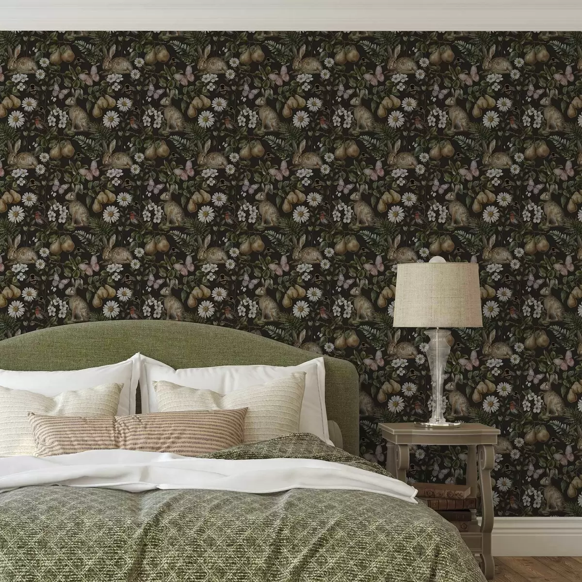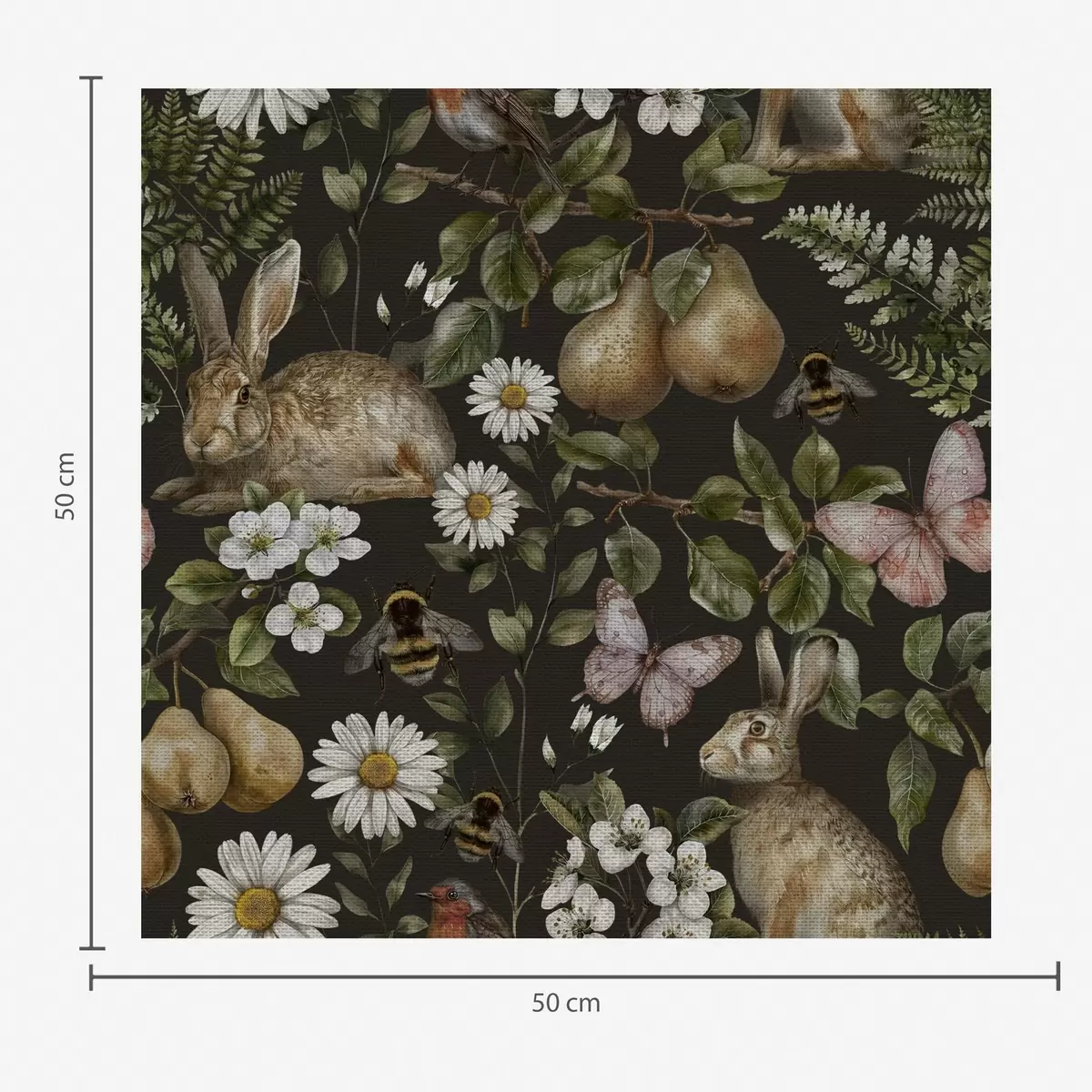 Tapetti Realistisia kaneja, päärynöitä, kukkia ja hyönteisiä tummalla taustalla Nr. a00401
