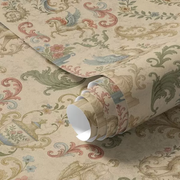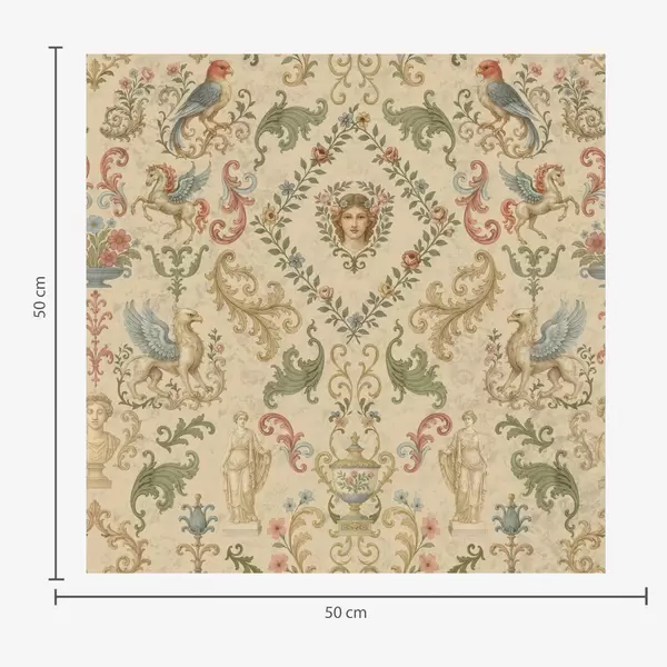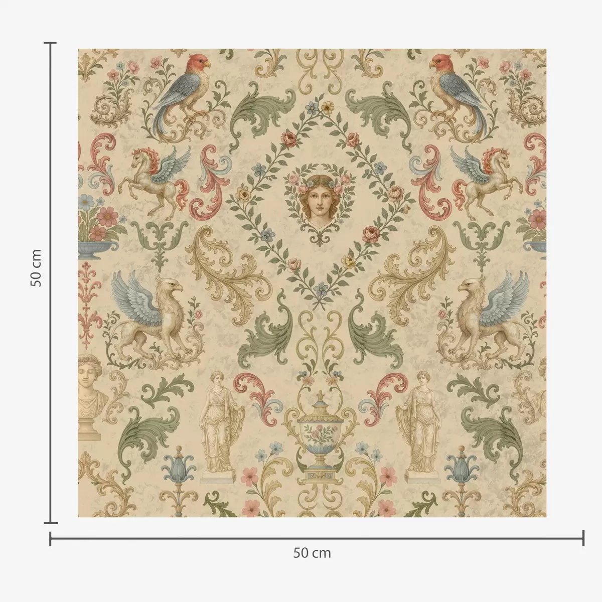 Tapetti Vintage-koriste, jossa on aarnikotkia, kukkia ja hahmoja Nr. a00402