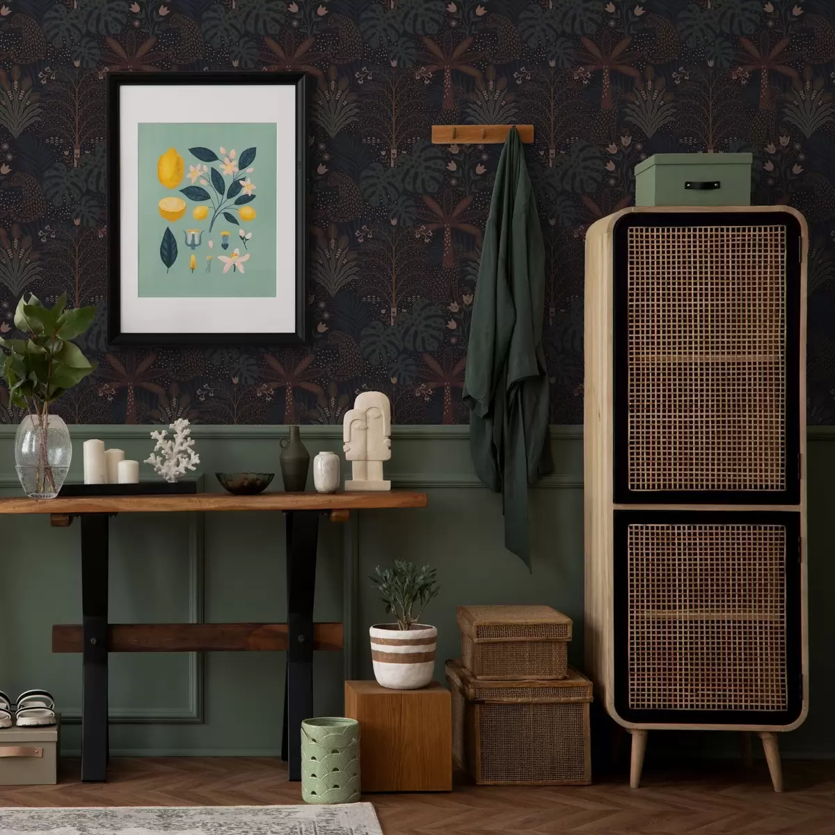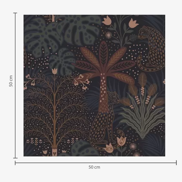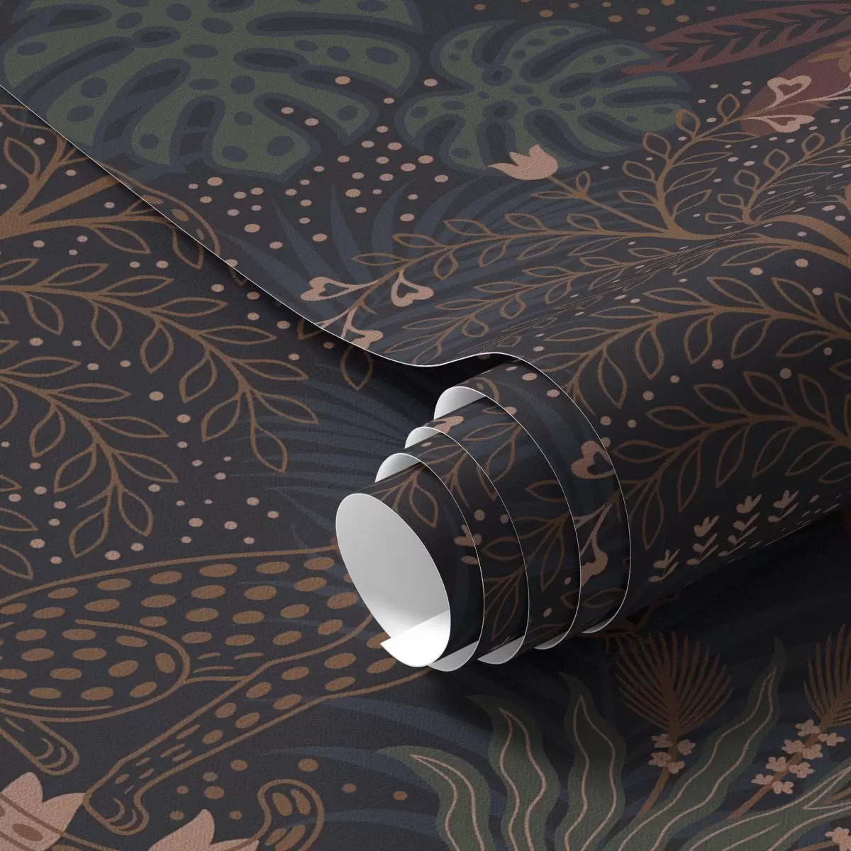 Tapetti Tumma viidakko leopardien, palmujen ja kukkien kanssa Nr. a00424