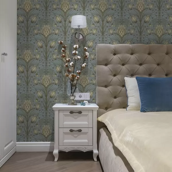 Tapetti Sininen kuvio, jossa on artisokkia ja tulppaaneja Nr. a00435