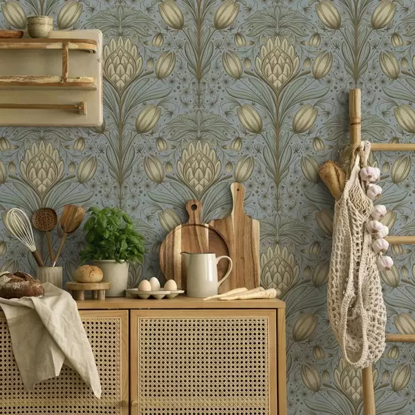 Tapetti Sininen kuvio, jossa on artisokkia ja tulppaaneja Nr. a00435