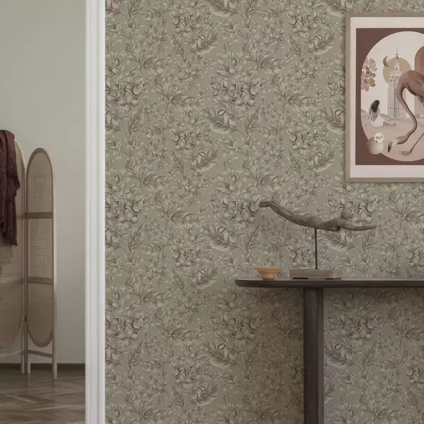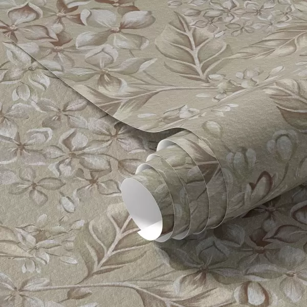 Tapetti Beige oksat valkoisilla kukilla lämpimissä sävyissä Nr. a00441