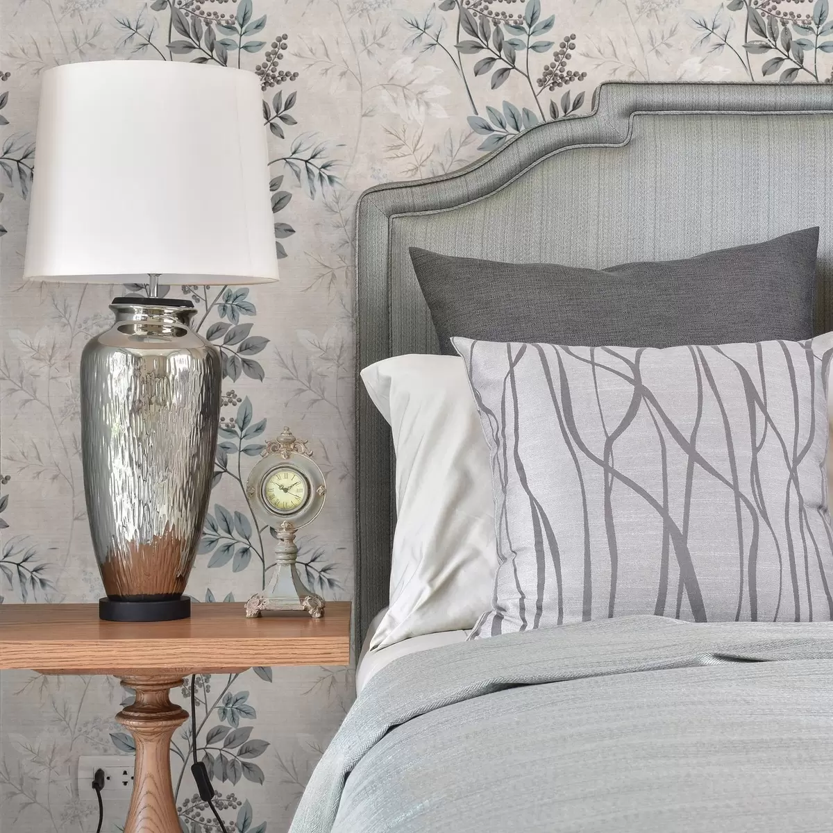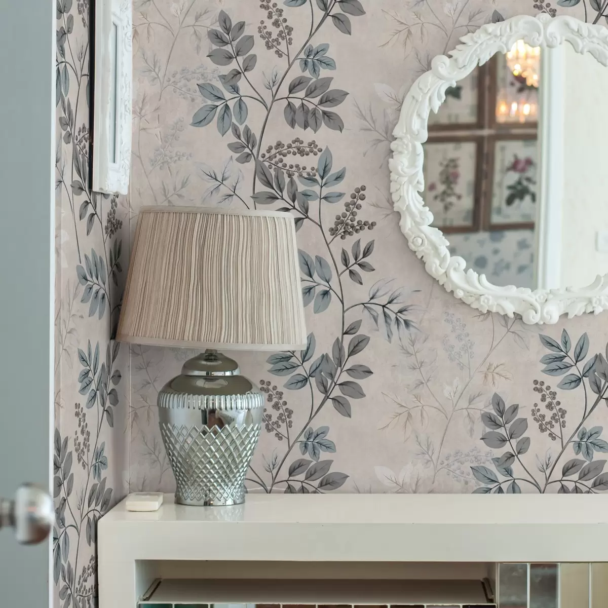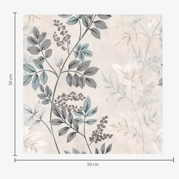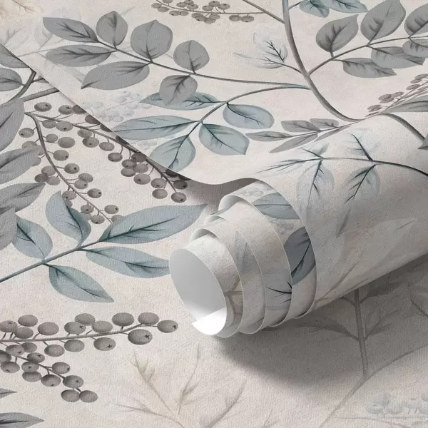 Tapetti Marjaiset oksat pastellinsävyisinä ja harmaansiniset lehdet Nr. a00443