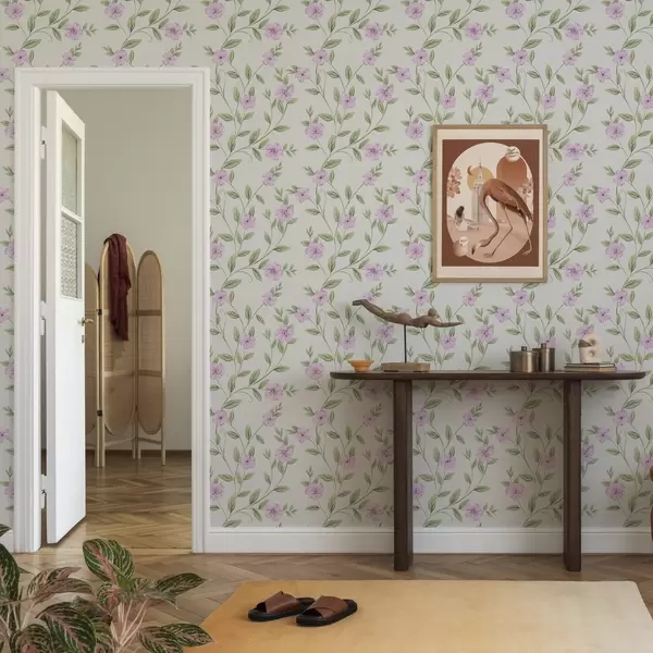 Tapetti Vaaleanpunaisia kukkia ja vihreitä köynnöksiä kermanvärisellä pohjalla Nr. a00453