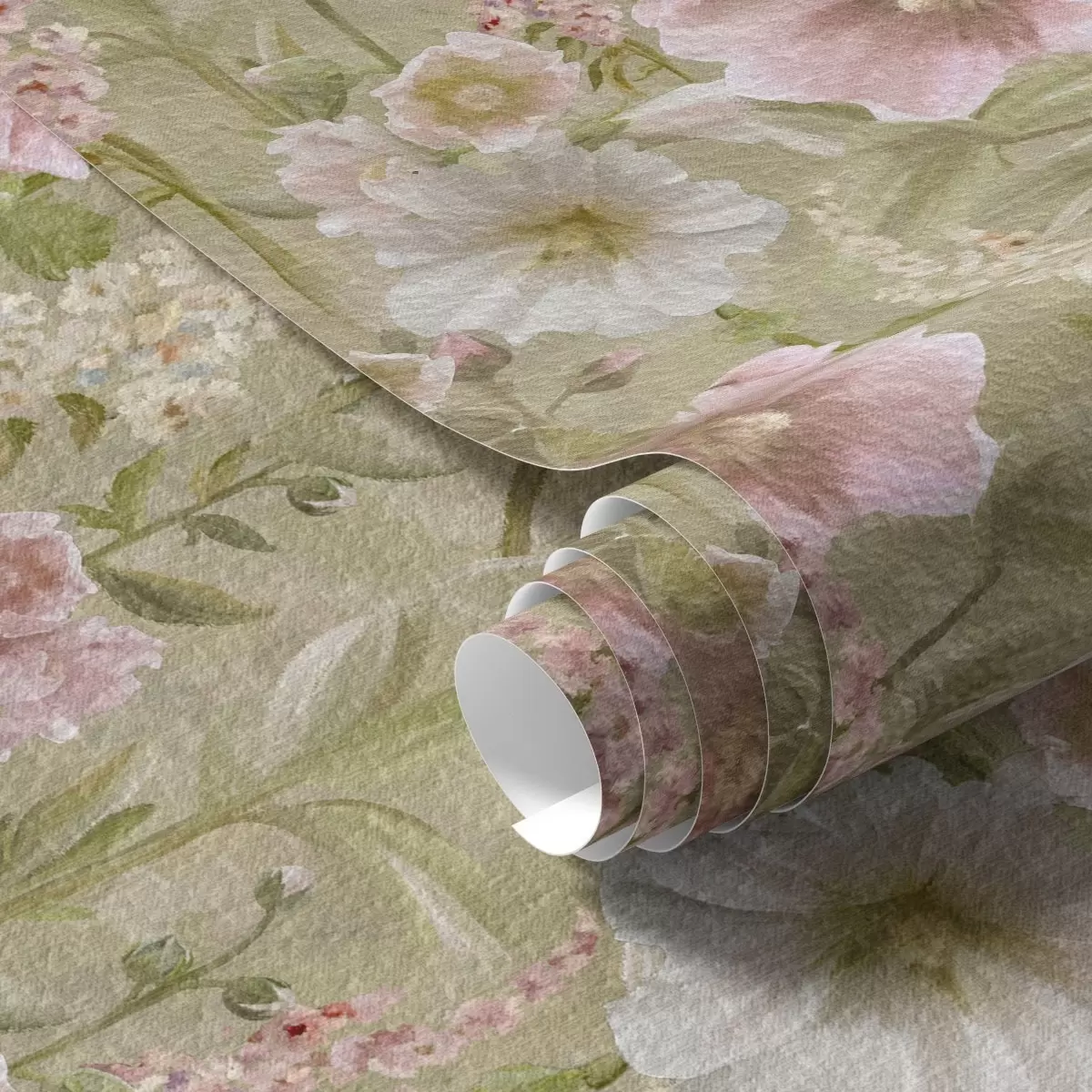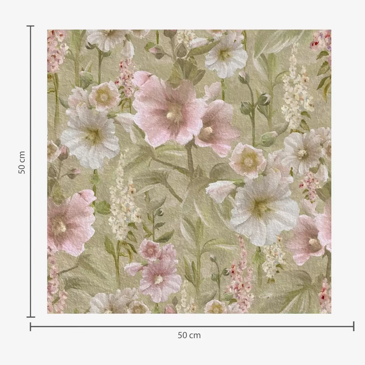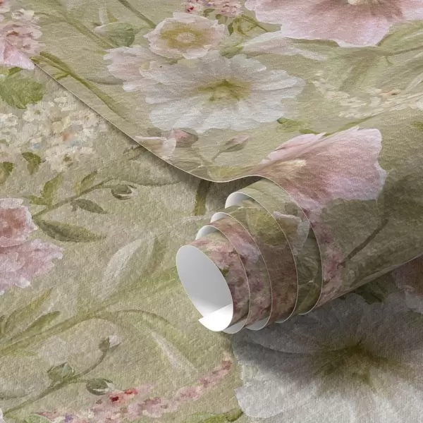 Tapetti Romanttinen vaaleanpunainen ja valkoinen hollyhocks on hillitty vihreä Nr. a00456