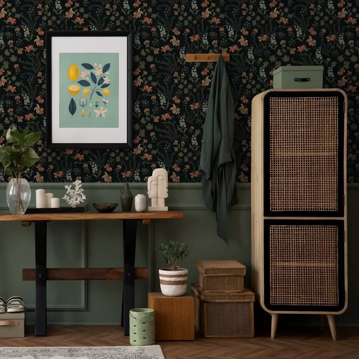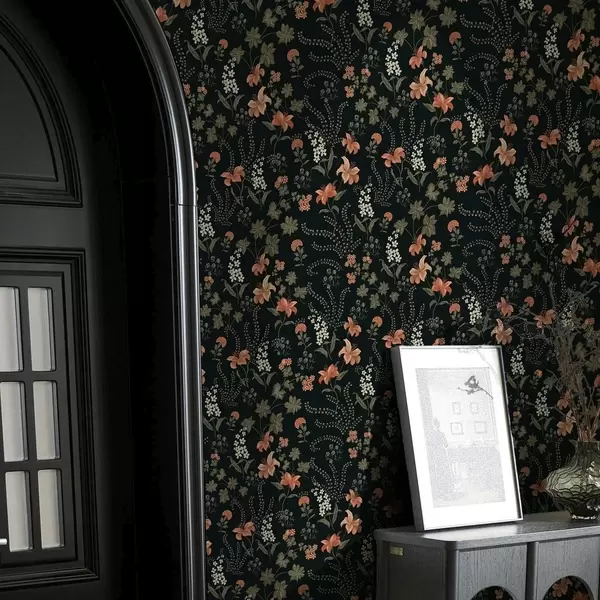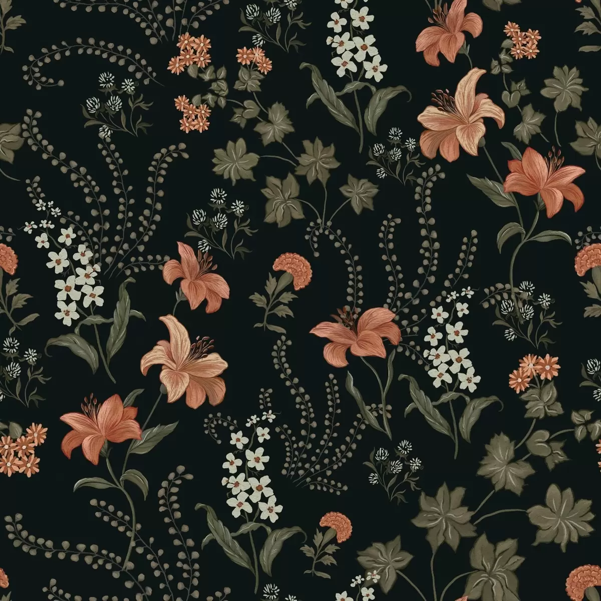 Tapetti Oransseja liljoja ja pieniä kukkia mustalla pohjalla Nr. a00463